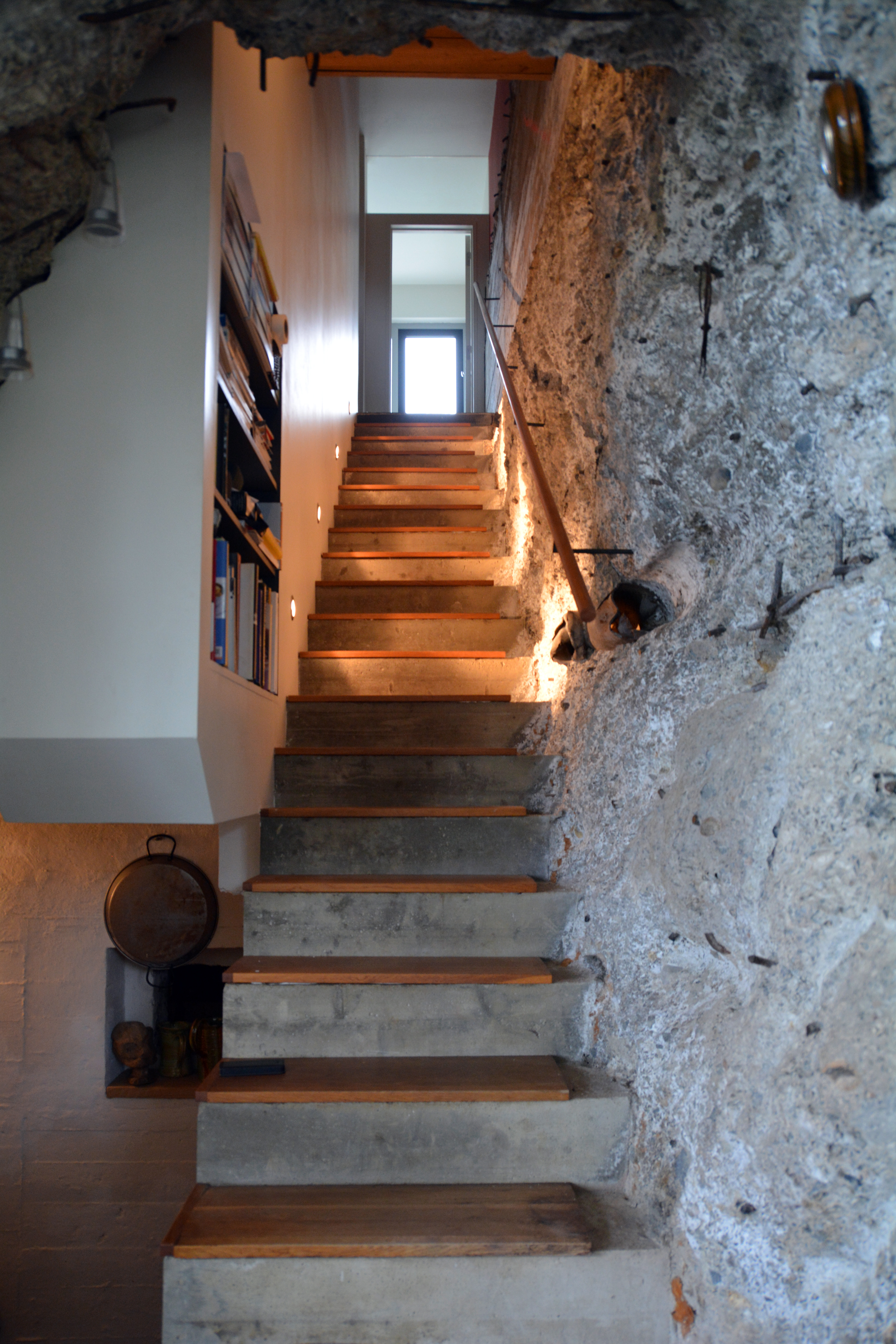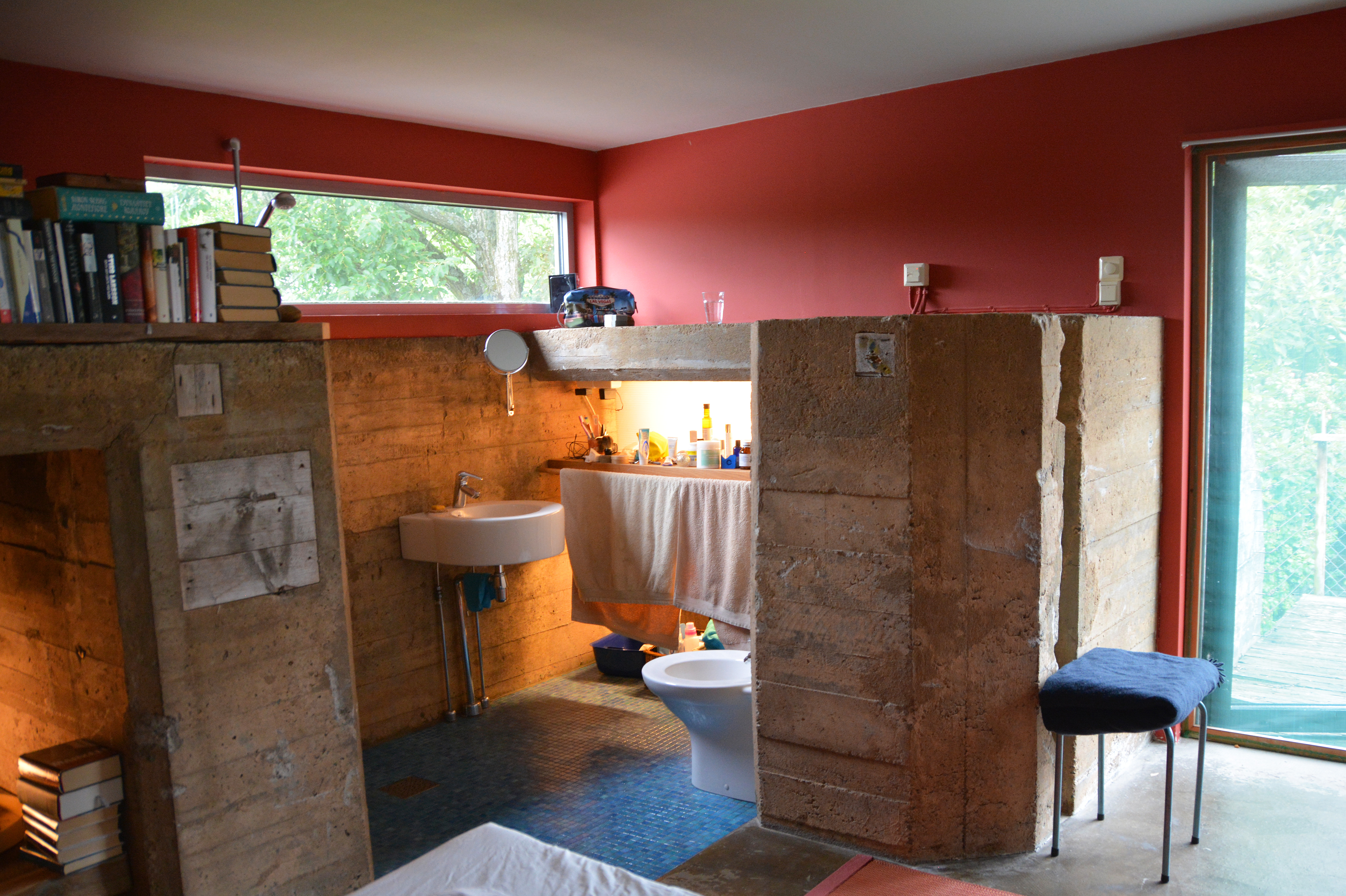 Hva hadde jeg så forventet meg av en arkitektmodifisert tysk bunker fra 1943? Hvitkalket minimalisme? Malte trepaneler? Eller tepper på veggene, for hyggens skyld? Ja, alt det kunne jeg forestilt meg, men kanskje ikke akkurat det som faktisk møter meg: Mer betong, ubehandlet og brutal, biter av rør, armeringsjern som stikker ut. Her er nye, pussede flater som møter ru, dryssende betong. Men midt i alt dette noe forunderlig levende og kunstferdig: Den allestedsnærværende betongen er full av sjatteringer, her kan en se spillet i ulike typer sand som er brukt i støpingen, sand hentet fra ulike steder lokalt. Her er spor av salt som gjennom årene har sivet ut gjennom betongen med fuktigheten. Veggene er fulle av liv, som kunstverk enkelte steder.