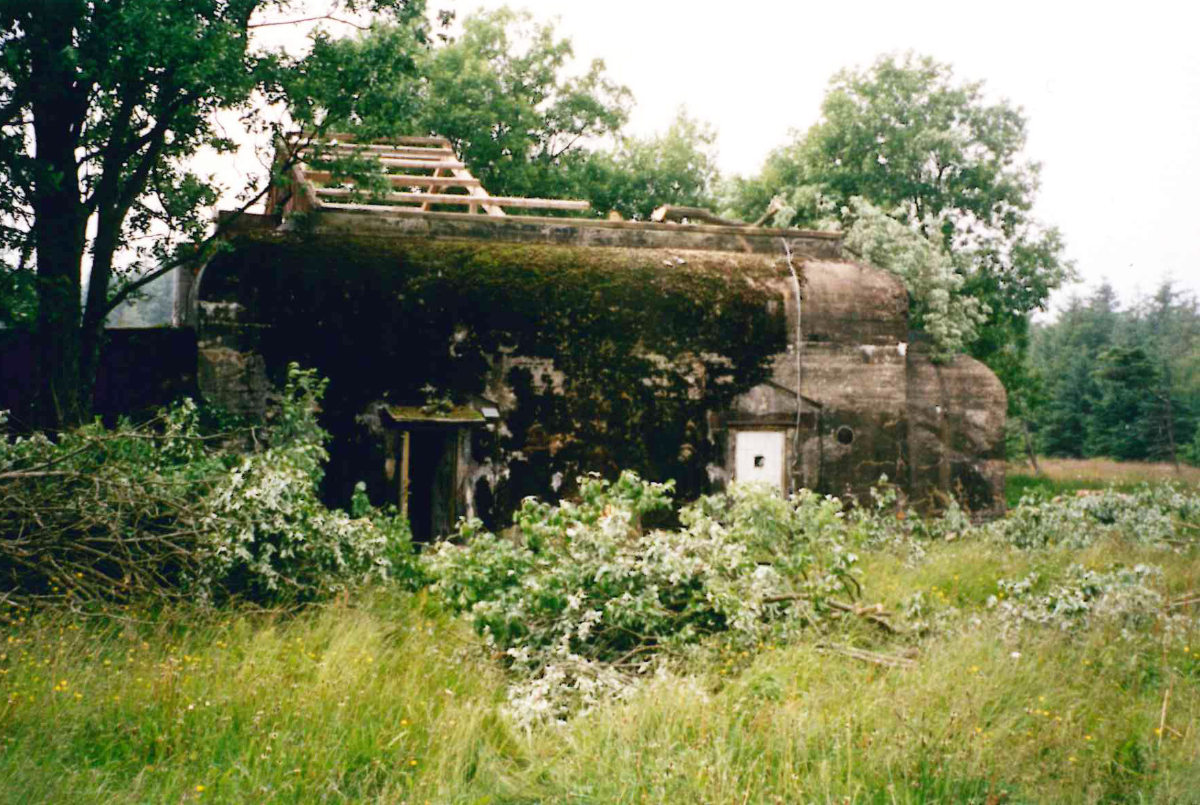 Spor som den tunge blå døren i 50 mm panserstål – enhver kan jo få et snev av klaustrofobi innelåst bak den – betongveggene i seg selv, armeringsjernet, alt dette vitner om et bygg som er reist som et forsvar, med voldelige hensikter, uten spor av menneskelighet. Men ut over det er det ingenting som åpenbart forteller noe om krigen. Selv synet av de massive ytterveggene, når betraktet fra den frodige hagen med blomster, grønnsaksbed og matestasjoner for fuglene, får i alt sitt forvitrende, mosegrodde velde en egen estetikk. De sporene som finnes må tolkes, eller man må kjenne deres opphav og bakgrunn. Som noen beskjedne kvadrater av treverk i betongen oppe i andre etasje, den ene rundt 40x40 centimeter, de to mindre 10x10 cm. Jeg lar umiddelbart hånden gli over dem, det myke materialet skiller seg ut fra all den harde betongen, og jeg ser spørrende på dem begge.