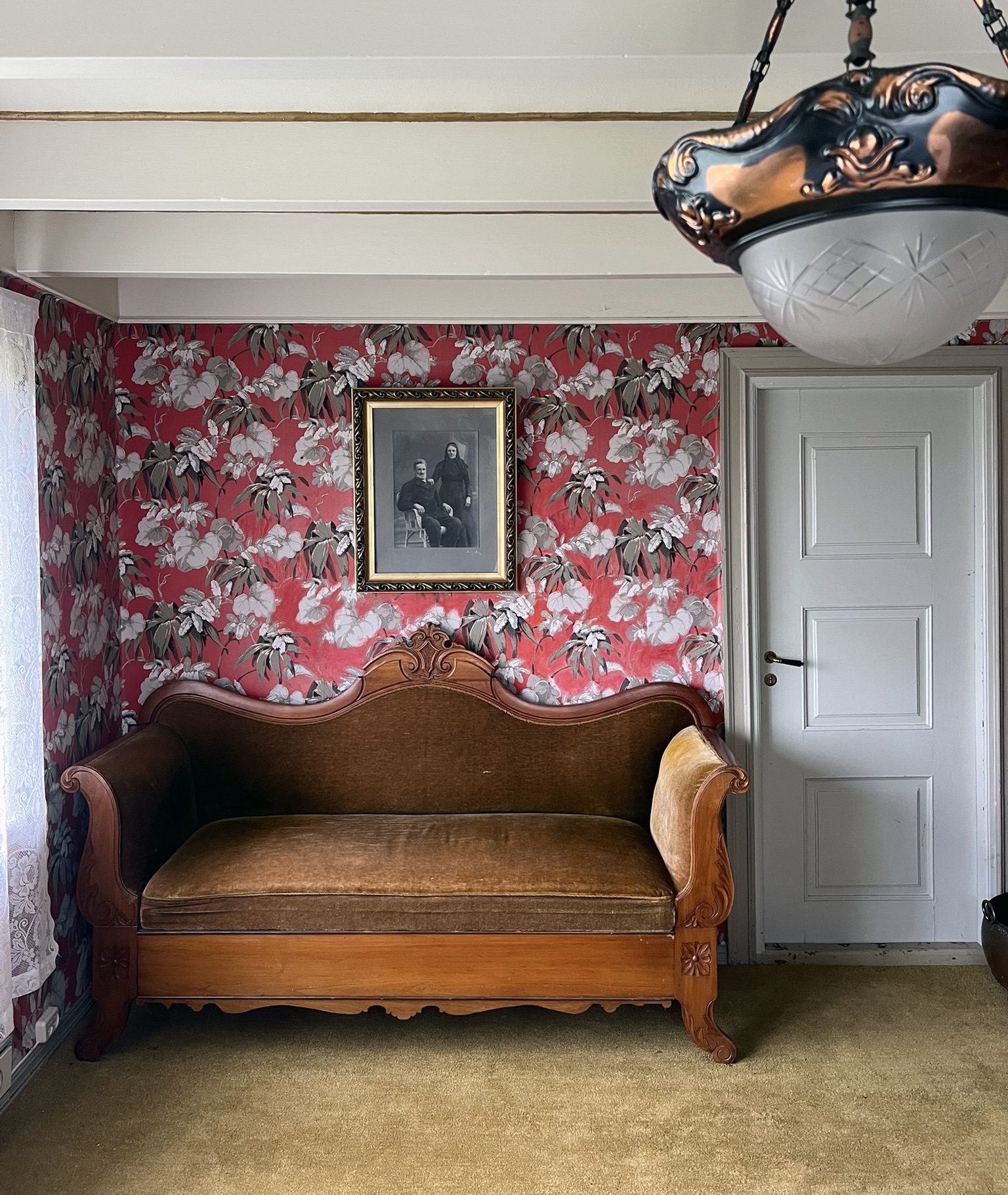 – Se bare på fargene, det er et system her. Blomstrete linoleum, blomstrete tapet. Gul linoleum, gul vegg. Rommene snakker til hverandre. Det kan jo være bestemoren min som bestemte noe, men det er en helhet her som jeg mistenker er resultat av et dyktig malerblikk.