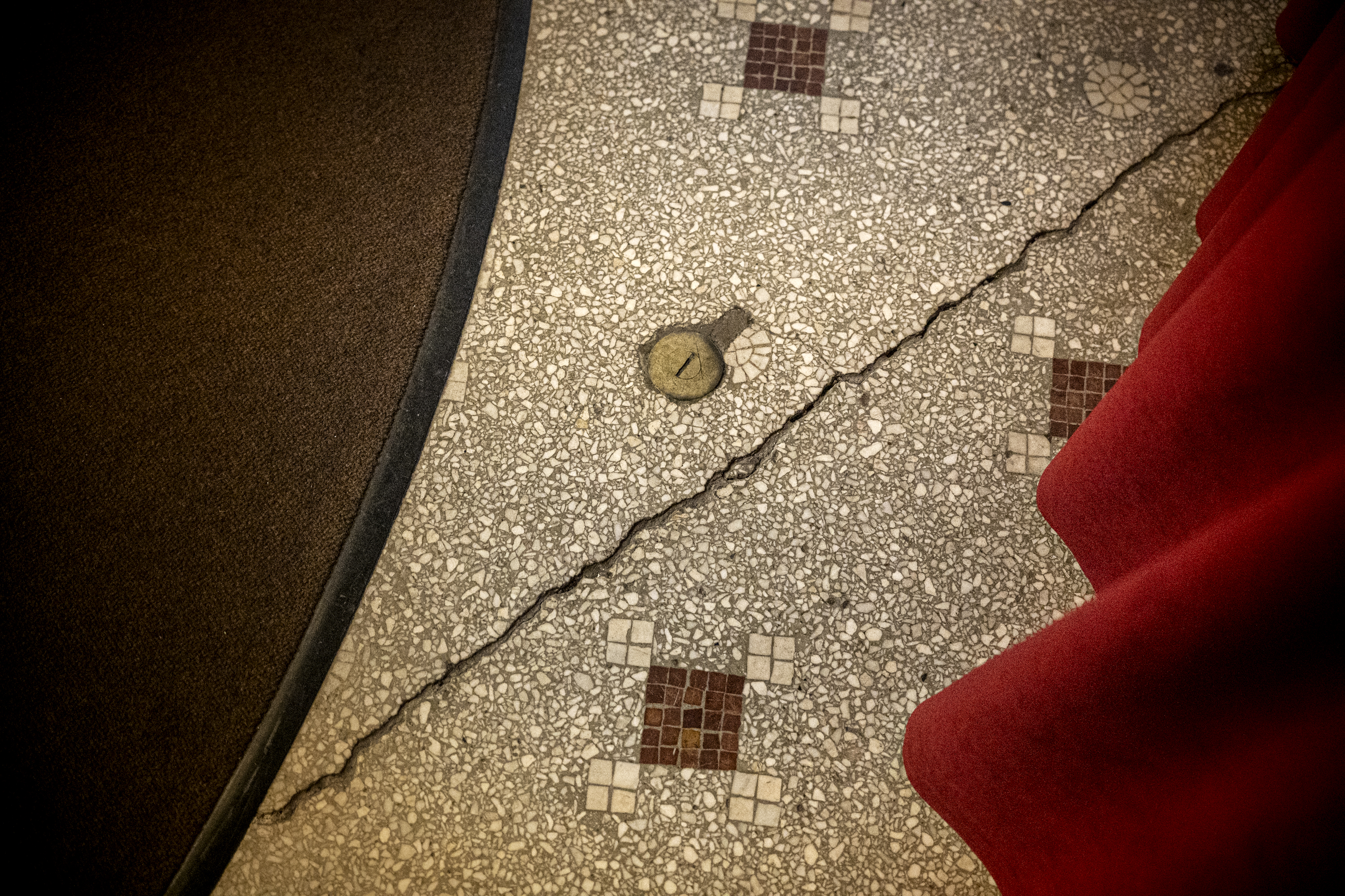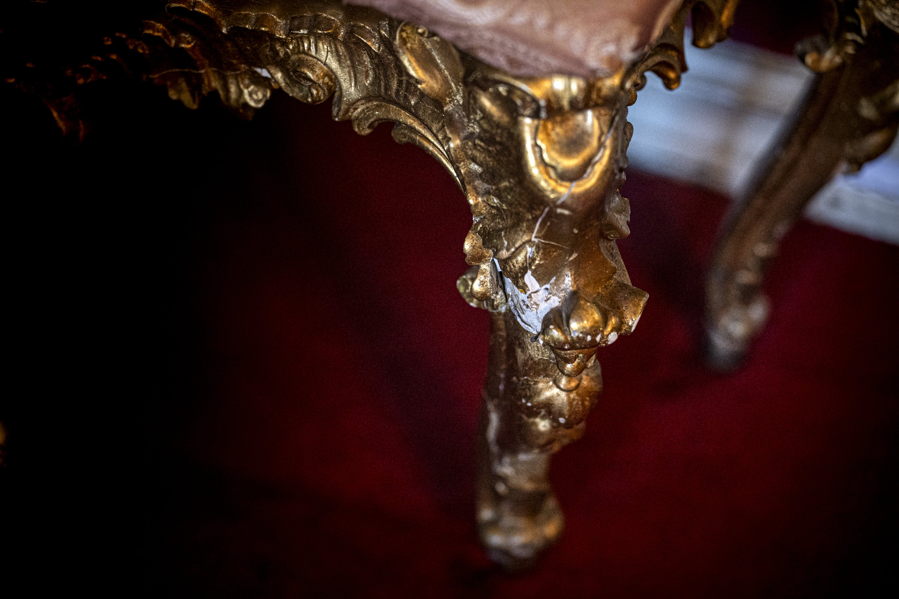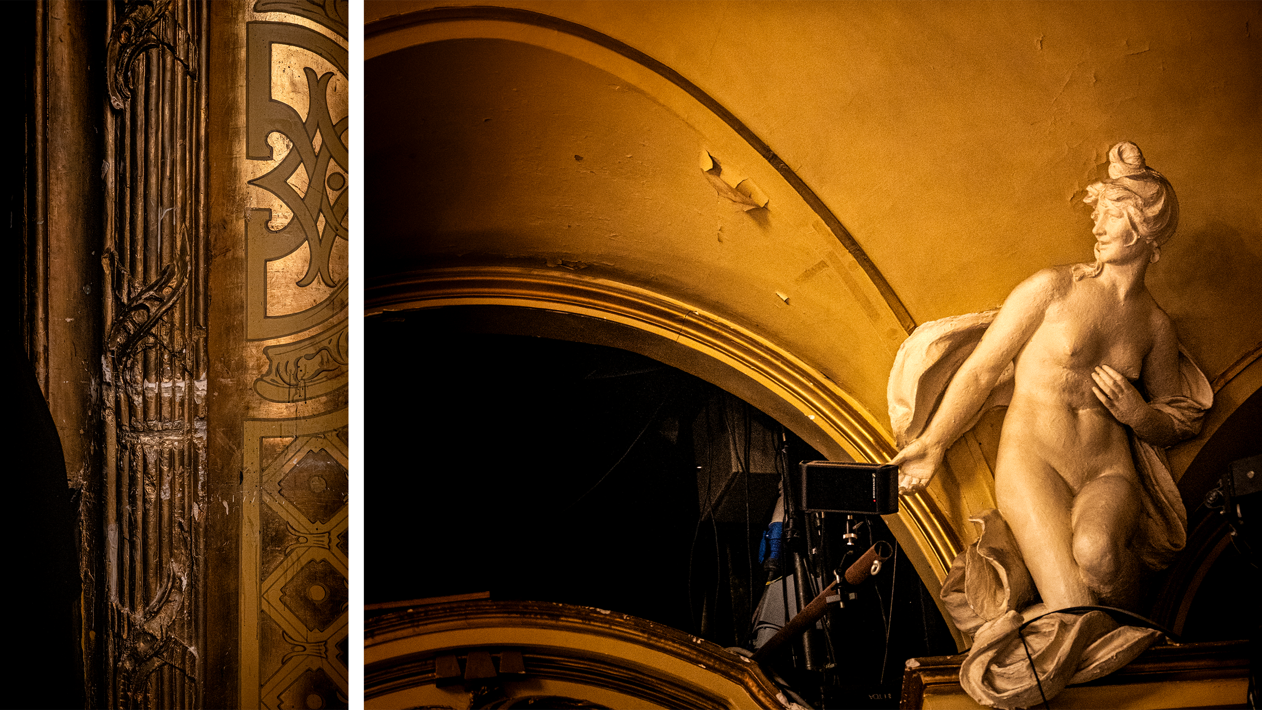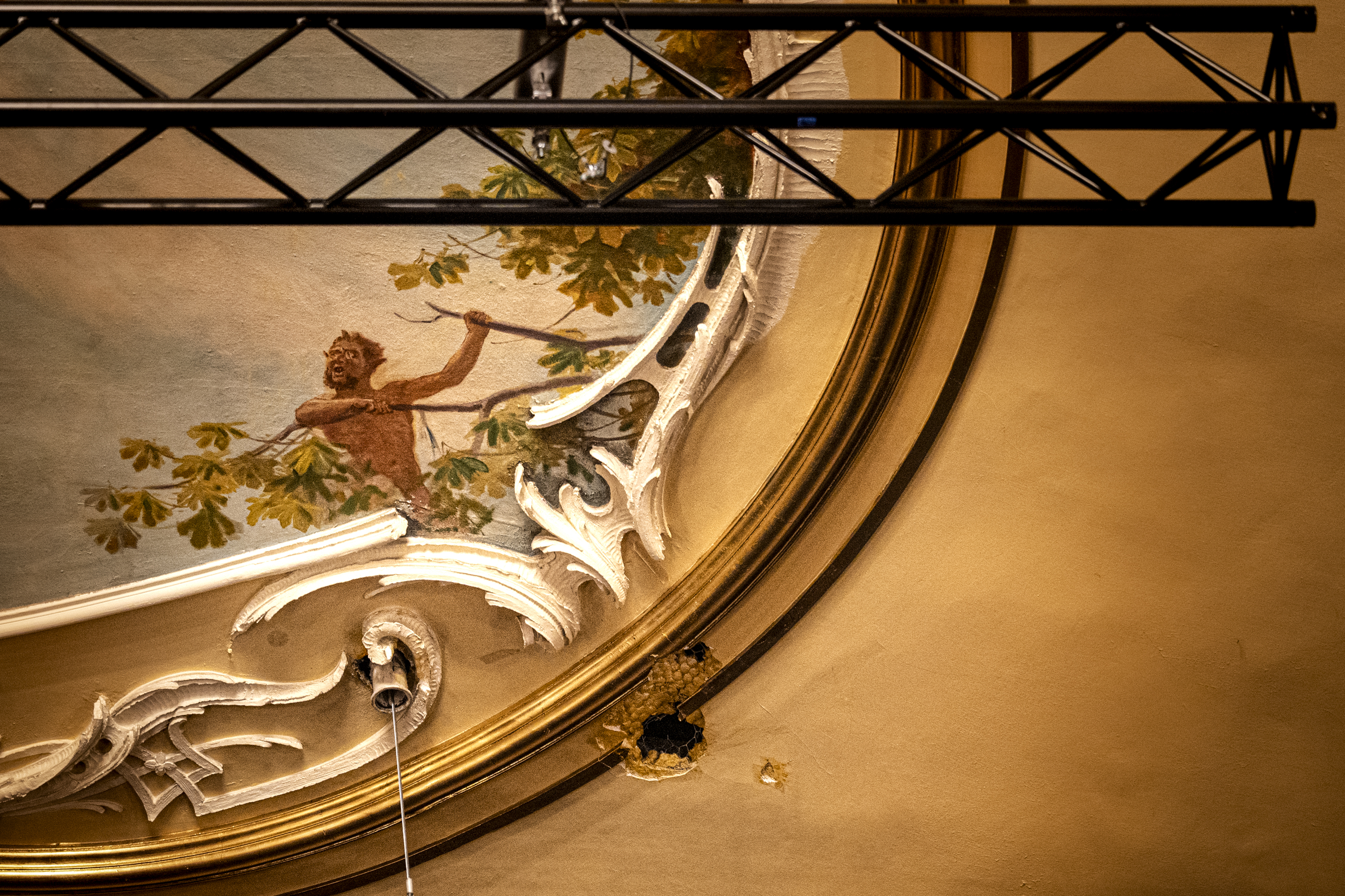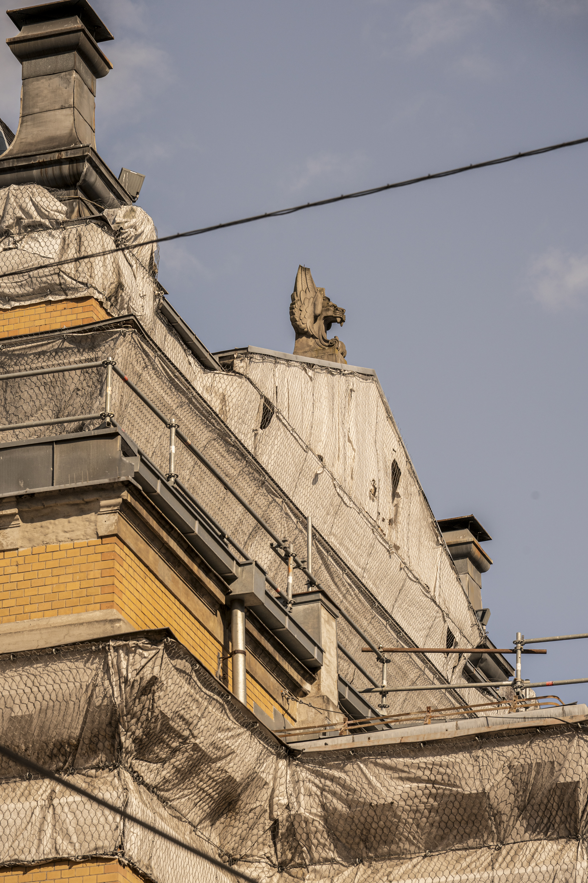 Monumentalbyggets vakre fasader i nybarokkstil holdes sammen av hønsenetting og stålarmering for å sikre mot ytterligere forvitring. På innsiden skjuler det seg store sprekker og slitasje i gulv og vegger.