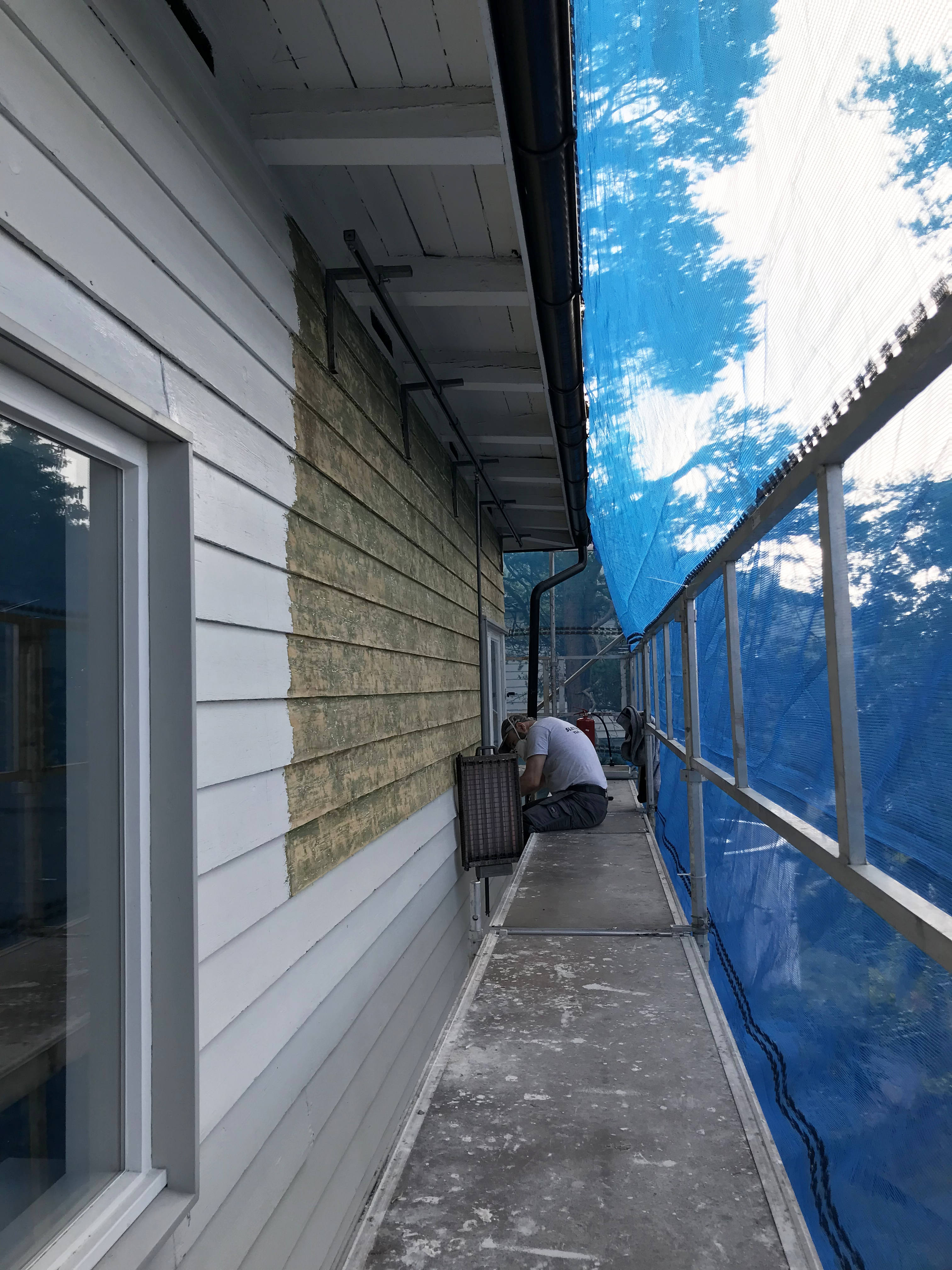 Neste steg i tilbakeføringen var å male om panelet på huset. Siste gang huset hadde blitt malt, var det brukt en plastbasert maling som hadde dårlig vedheft på det høvlede panelet. Store flak av malingen hadde begynt å flasse av, og det var fuktoppsamling bak feltene der malingen satt dårlig. Det ble besluttet å skrape ned all eksisterende maling ved hjelp av varmelampe, for å male det opp igjen med tradisjonell linoljemaling.
