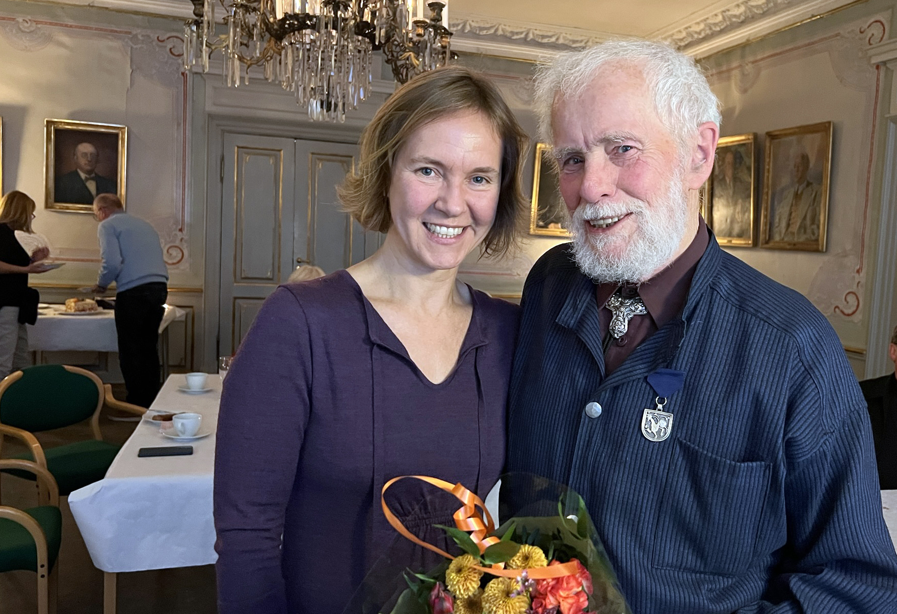 – Ja, det er litt sent, men medaljen kommer tidsnok! Det er viktig å hente frem de som har vært med så lenge og betydd så mye for kulturminnevernet. Den kollektive hukommelsen svekkes fort, og det er mange nye i dag som ikke kjenner til deg og det du har utrettet. Derfor er det så viktig å pusse blankt av de gamle heltene, sier Wilberg.