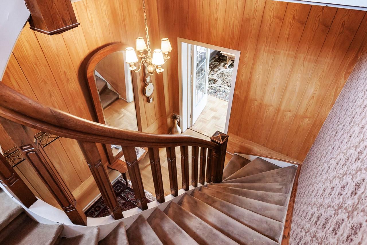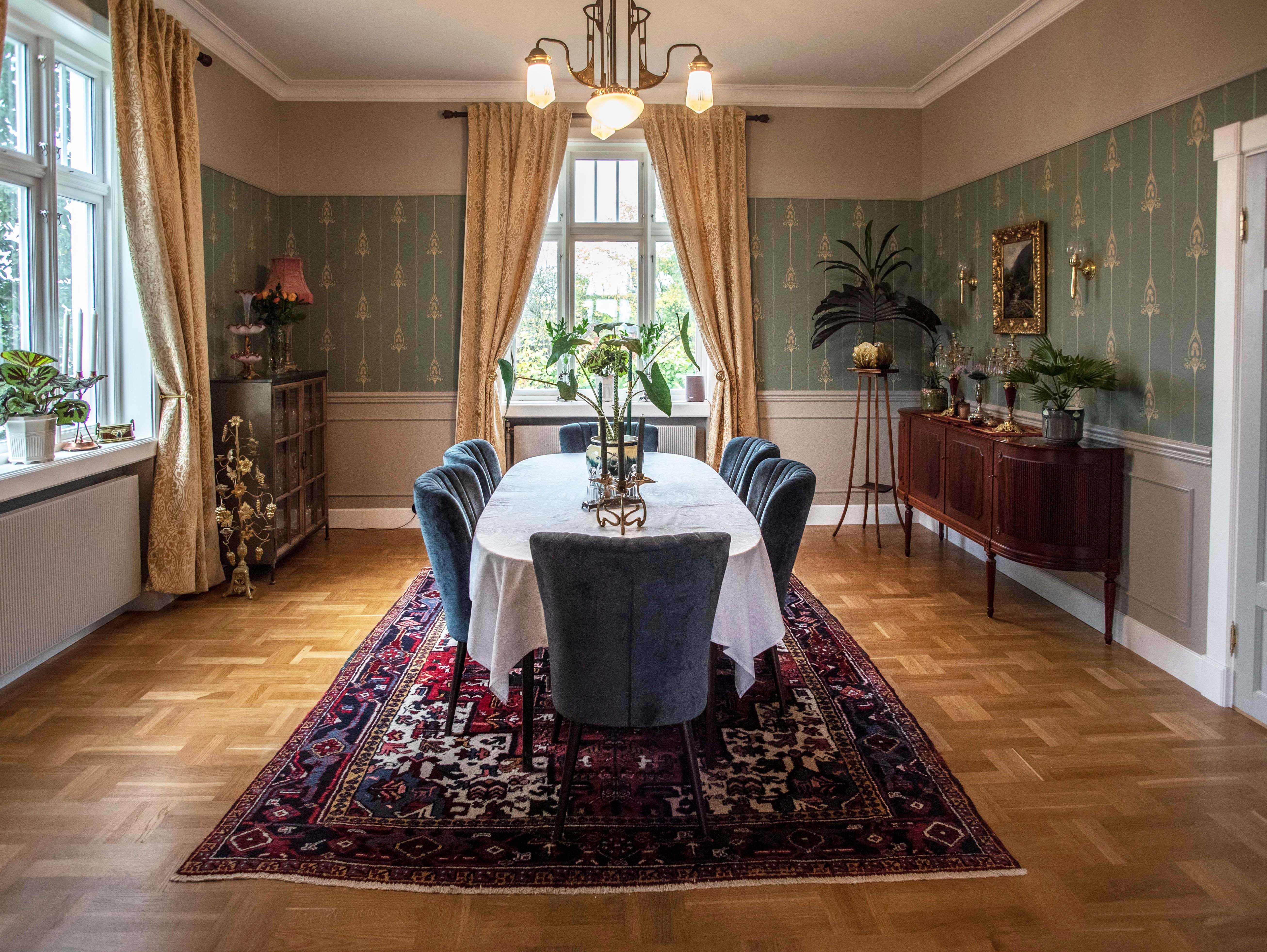 Vi trodde også at gullfuglen var skutt da vi oppdaget at det hadde vært gjennomgående fiskebensgulv med border og intarsia i alle stuene. Du kan bare tenke deg hvor stor skuffelsen var når vi innså at dette også var fjernet. Eikeparketten som ligger der nå kom på plass under en renoveringen på 60-tallet, og er i uklanderlig kvalitet. Likevel har vi lekt med tanken å få lagt en kopi av det som en gang var, en gang i fremtiden.
