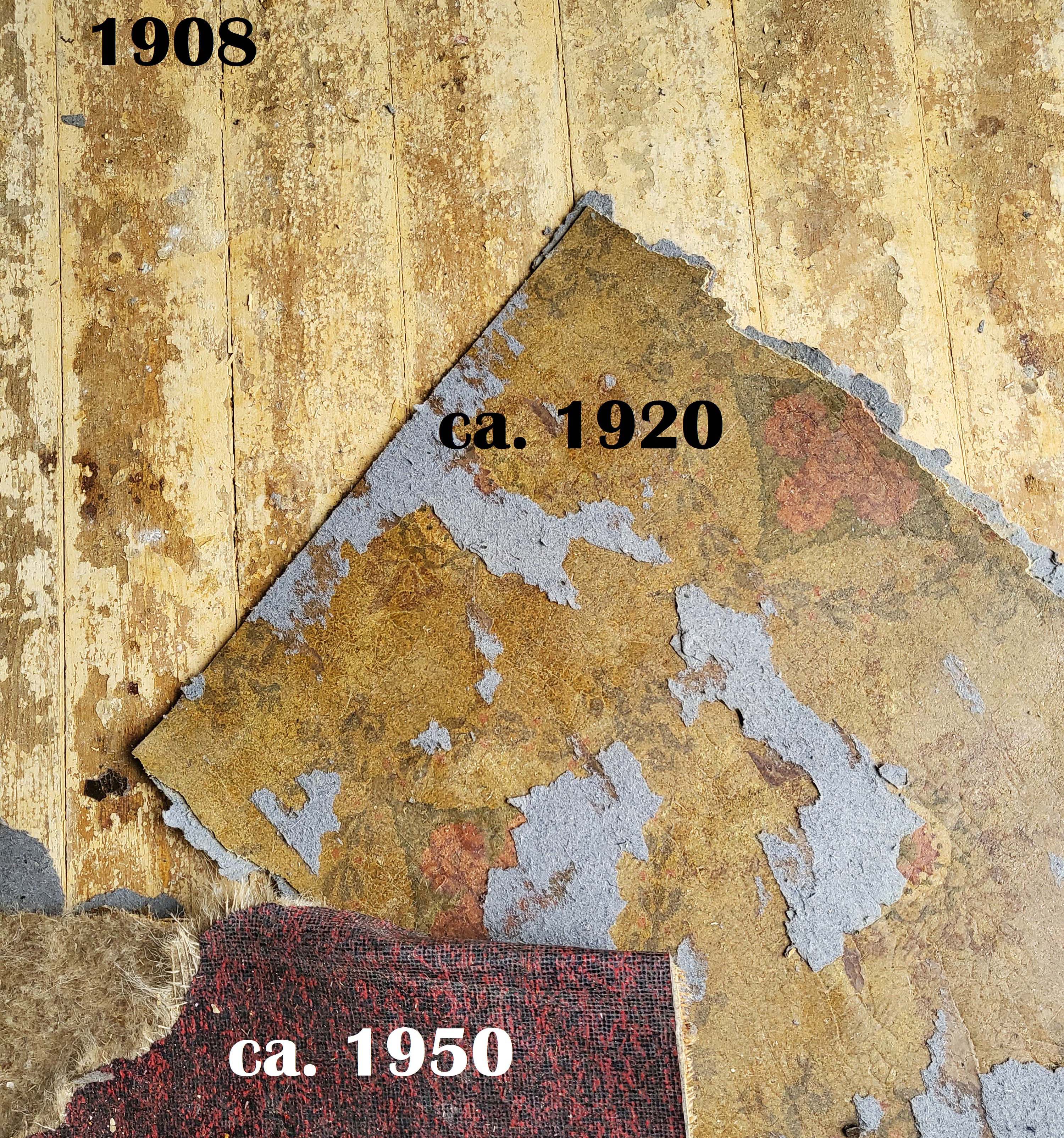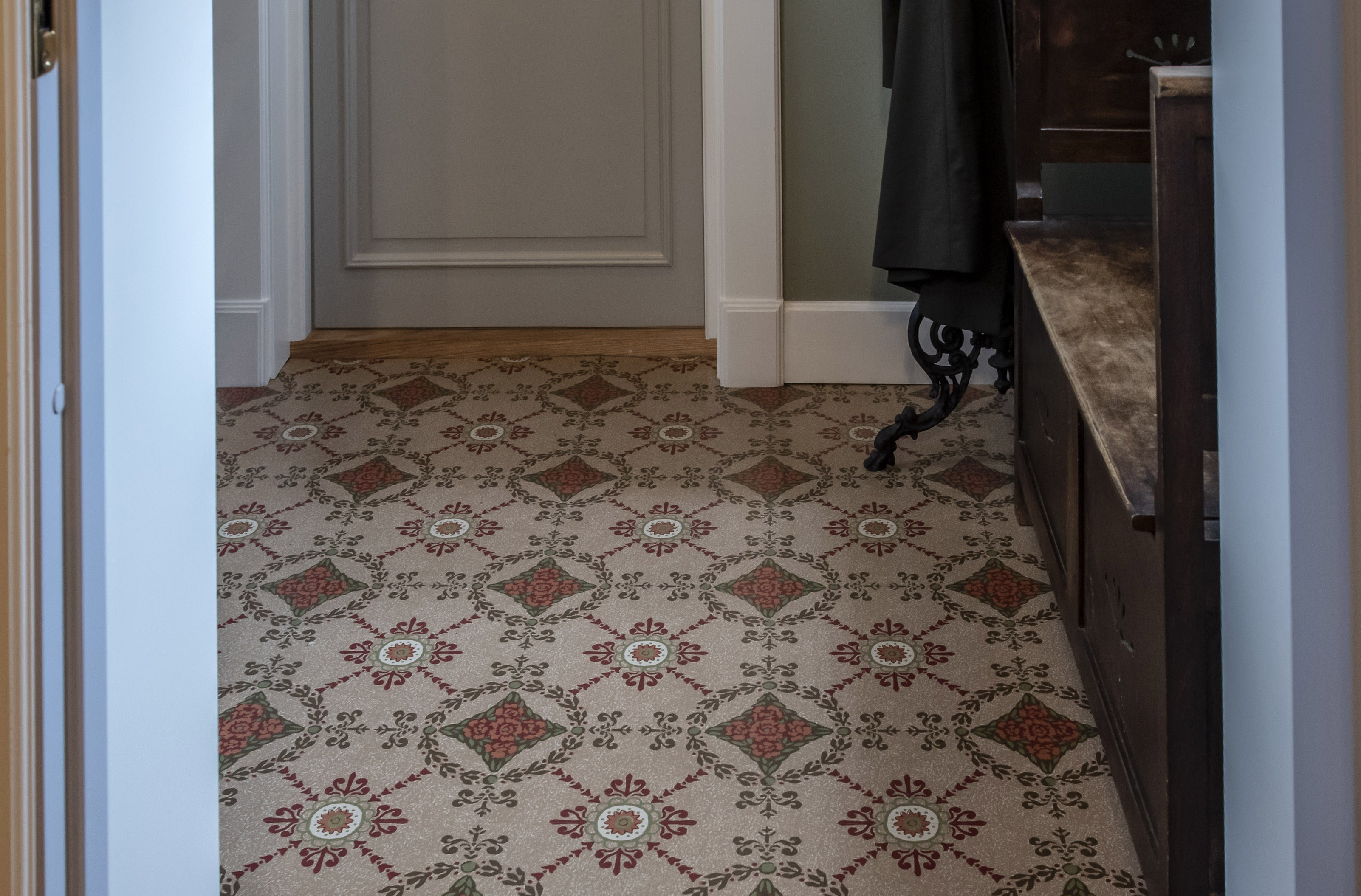 Vi hadde aldri tenkt at vi kom til å hoppe i taket av glede av å finne et gammelt linoleumsgulv for fem år siden. Det var likevel det som skjedde da vi midt i rivningsvrimlet kom over et litt spesielt mønster. Det var tydelig at dette ikke var fra hverken 60-, 70- eller 80-tallet, noe som gjorde oss svært håpefulle. Vi kontaktet Handtryckta tapeter i Stockholm som kom oss til unnsetning.