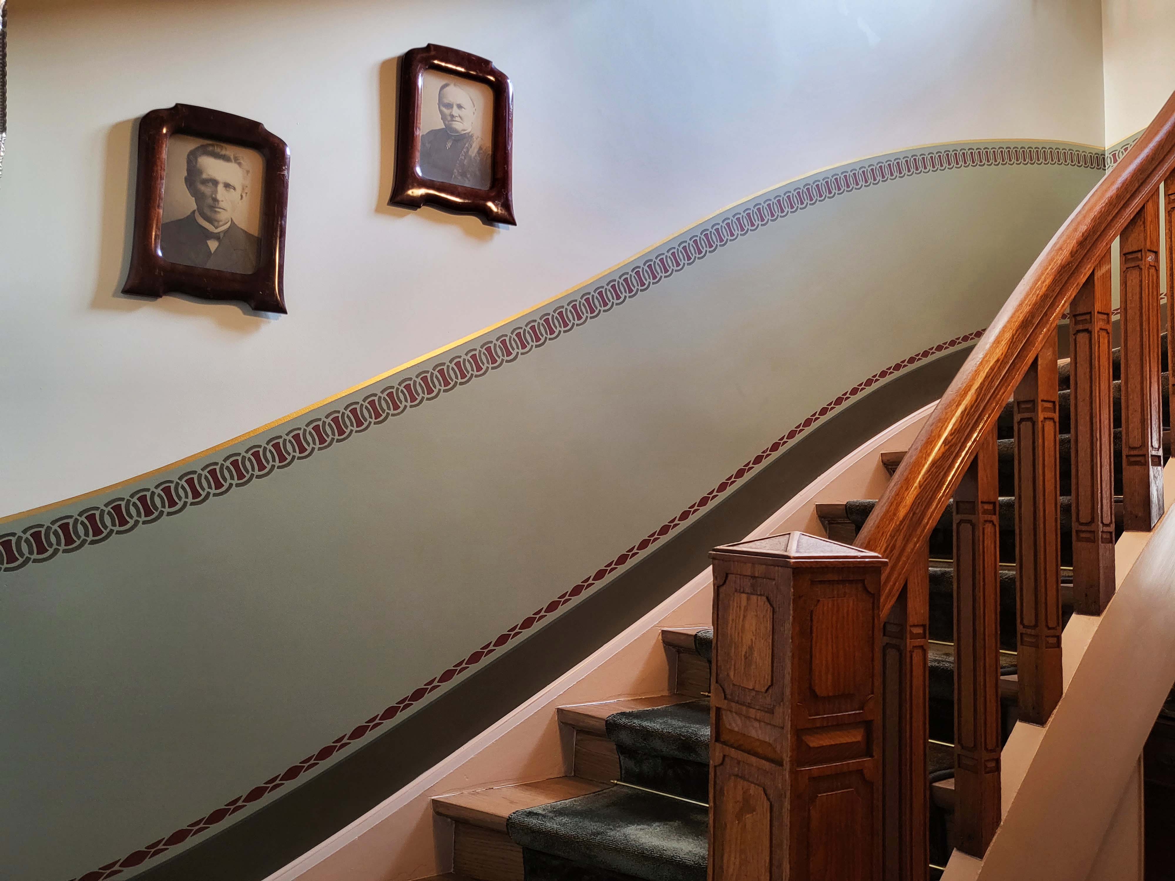 Familien Slorer var så bemidlede at da de pusset opp fjernet de alle «bevis» fra tidligere tider. For dem var det nok et symbol på velstand, men for oss kulturhistorikere ufattelig trist. Gleden var dermed ekstra stor da vi oppdaget påmalt mønstre på muren i hovedtrappeløpet. For under lag med gummierte tapeter fant vi sirlig utført bølgende mønstre med geometriske former opp langs trappen med avsluttet gullkant på toppen.