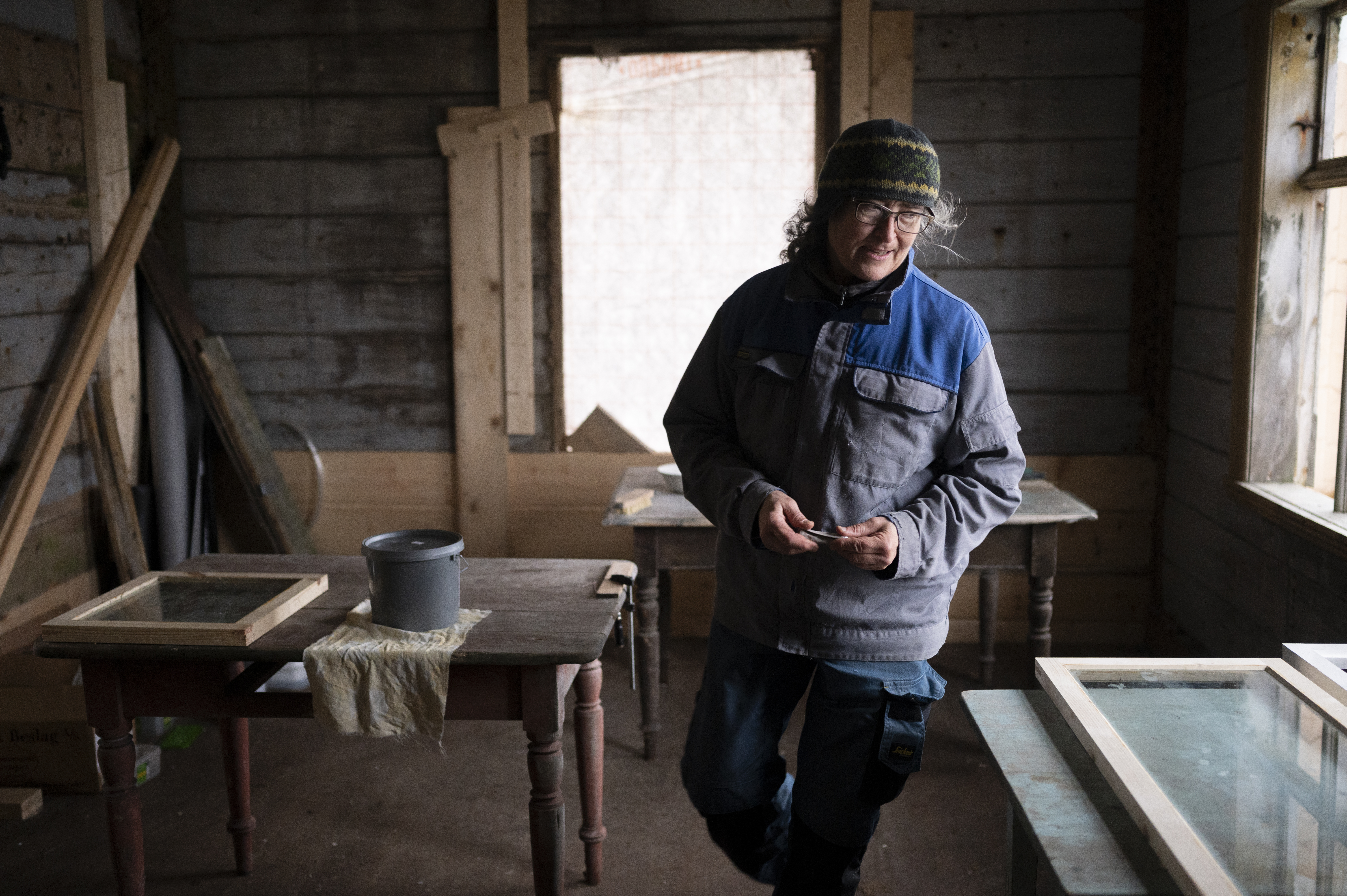 – Jeg har vært på Røst før, jeg! ler Mari. – Jeg var her faktisk på en annen workshop i sommer. Da lagde vi blant annet vindusrammene til noen av de vinduene vi nå setter sammen. Så det er jo veldig kult å få være med på hele prosessen.