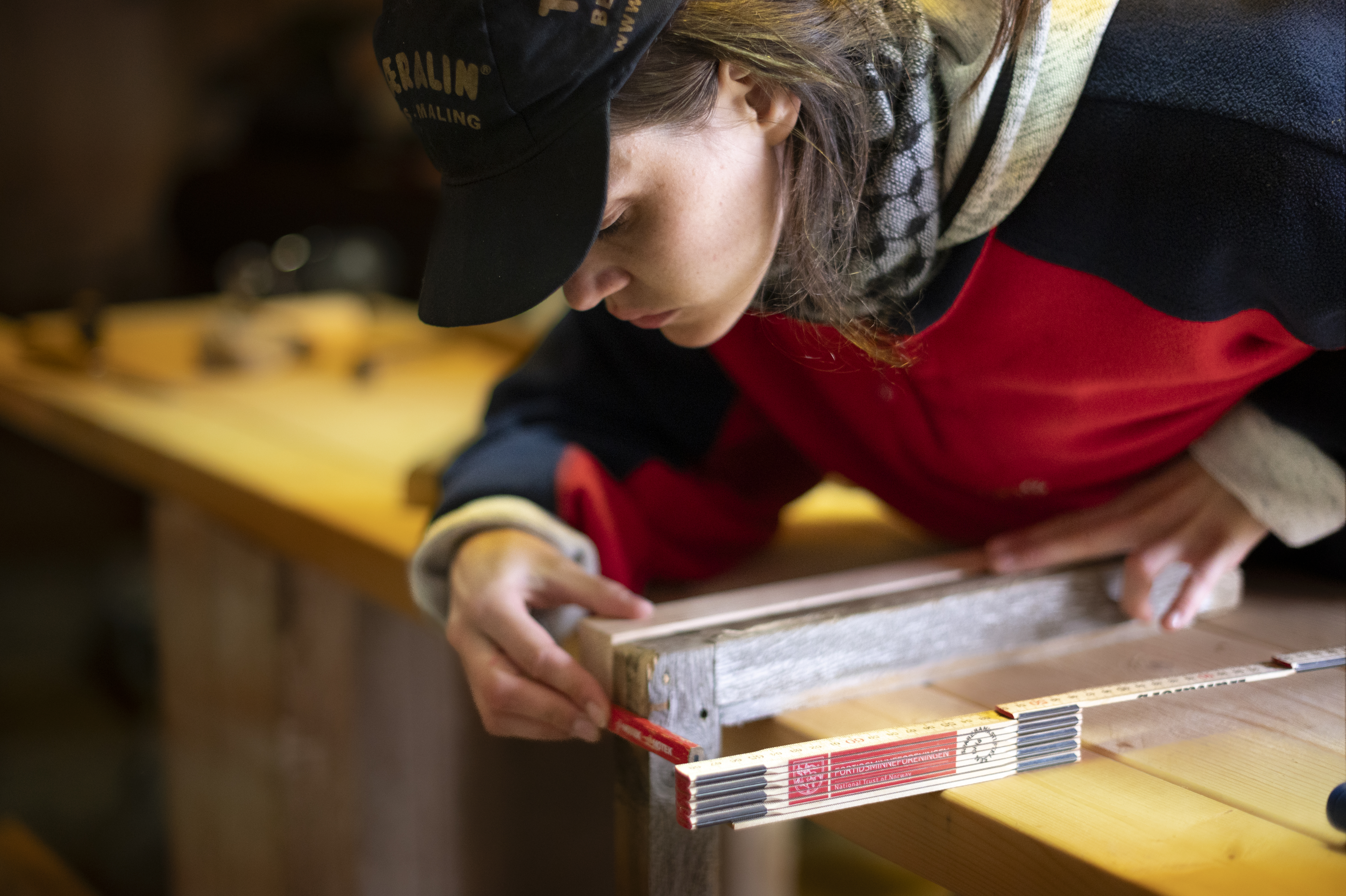 Merle forteller at det er svært få kvinnelige tømrere i Danmark, og at hun er eneste jente i sin klasse. Til vanlig jobber hun med bindingsverk.