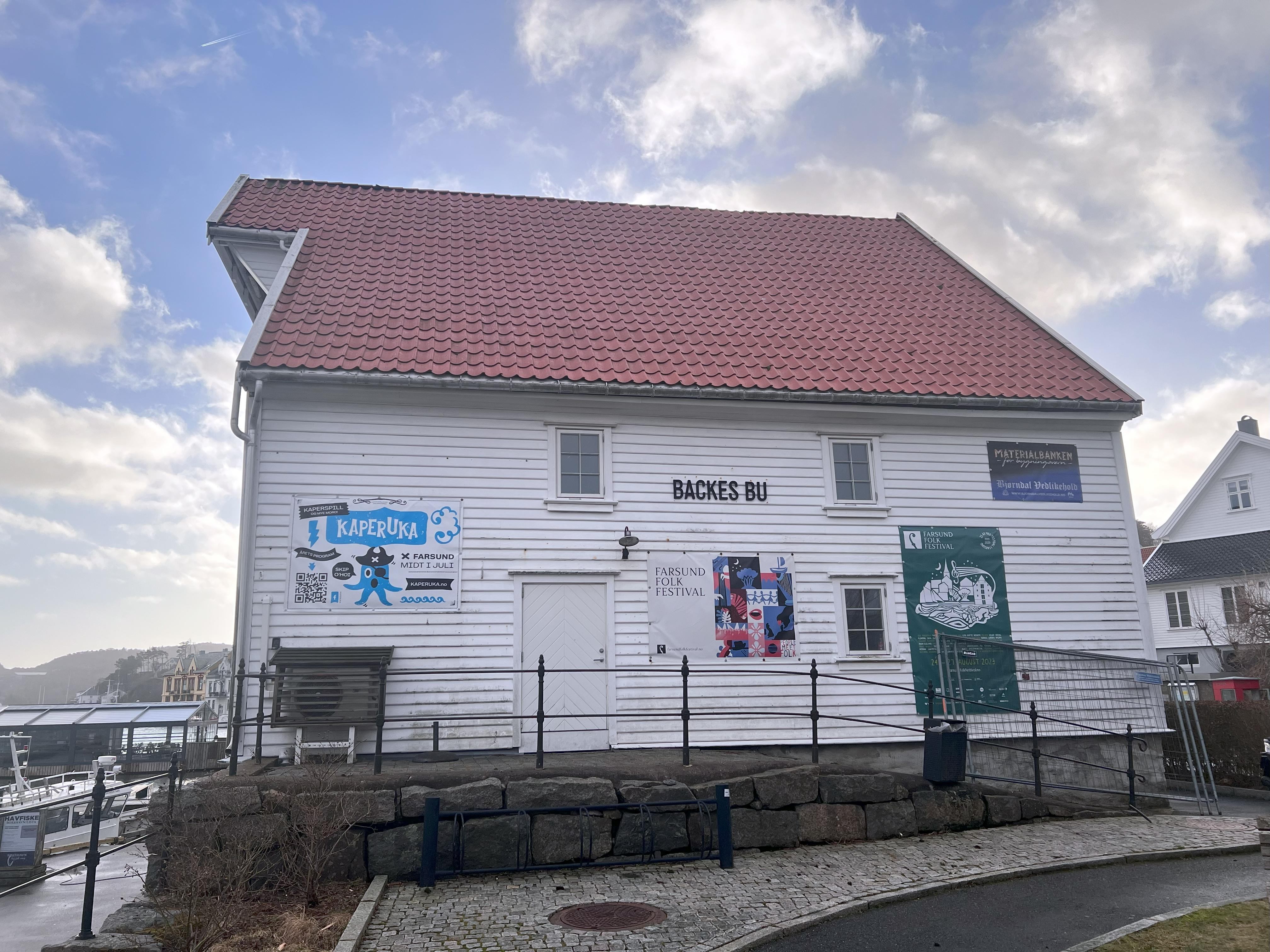 En haug gamle planker, dører og andre gjenbruksmaterialer kan lagres hvor som helst, i en låve, en moderne lagerbygning. At de akkurat her lagres i et knippe bygninger som selv er bygget av gjenbruksmaterialer skaper en ekstra dybde til fortellingen. For det er en fortelling, det som er blitt til Materialbanken i Farsund.