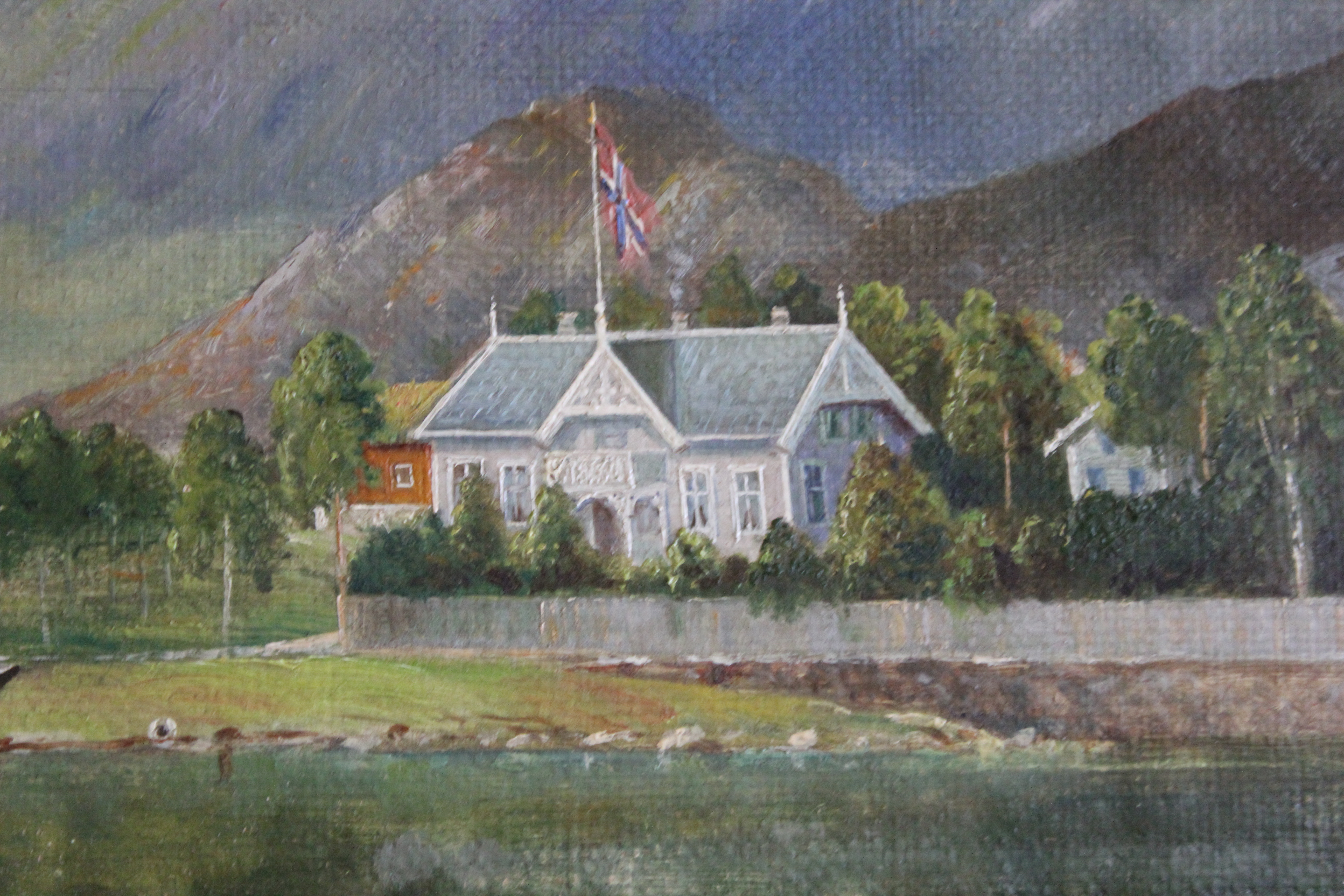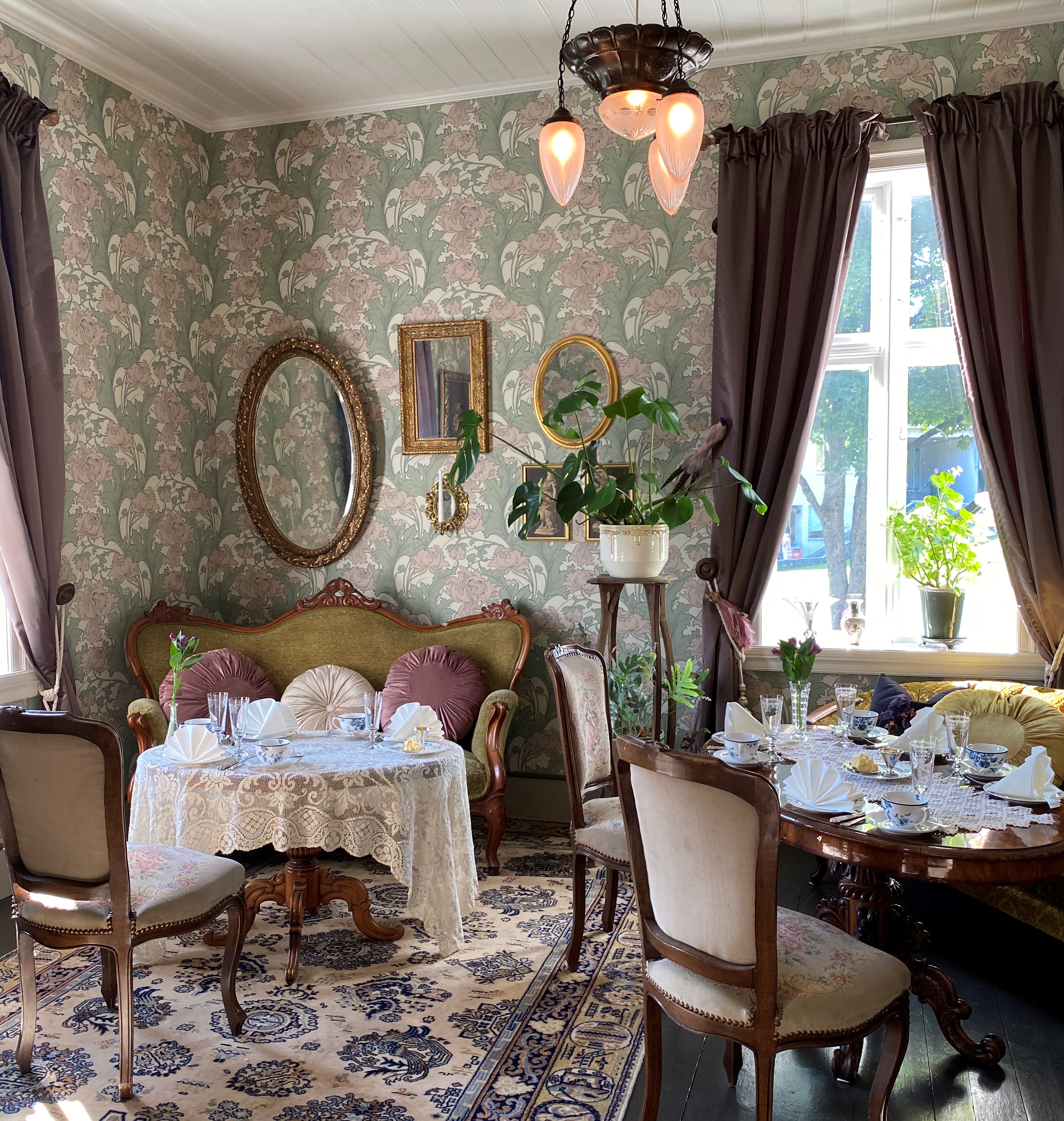 Eit stort og vakkert maleri av husa og eigedomen har vi fått kjøpt attende. Dette har vore til inspirasjon for oss i gjenskaping av husets fasade og fargar. Vi har søkt i bildearkiver, spurt og gravd for å få mest mogleg informasjon om både interiør og eksteriør. Snakka med alt av bygningsvernere og spesialistar på både maling og tapeter, reist i både inn- og utland for å finne tapeter eller for å gjenskape dei.