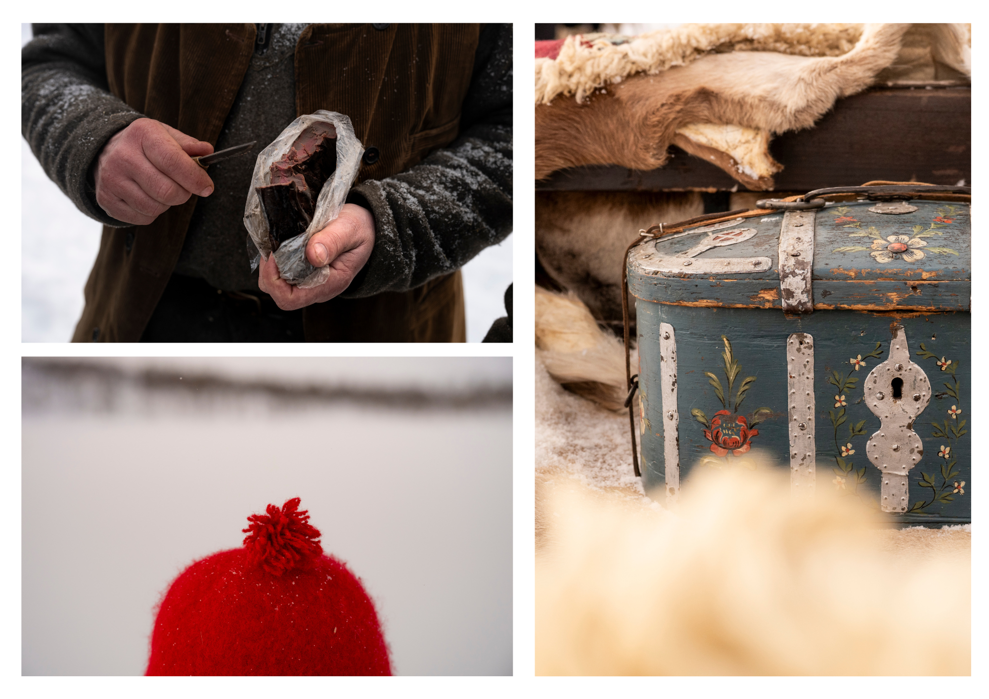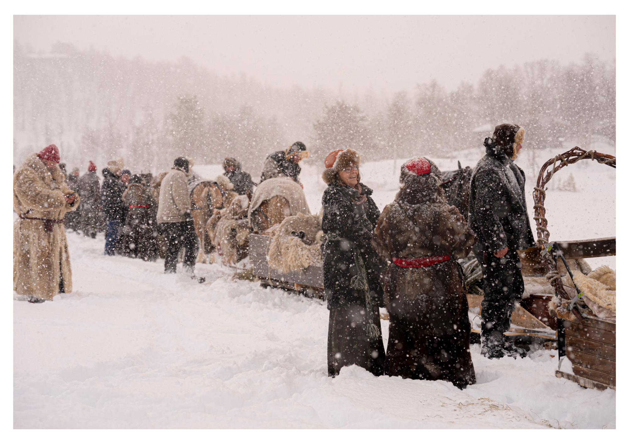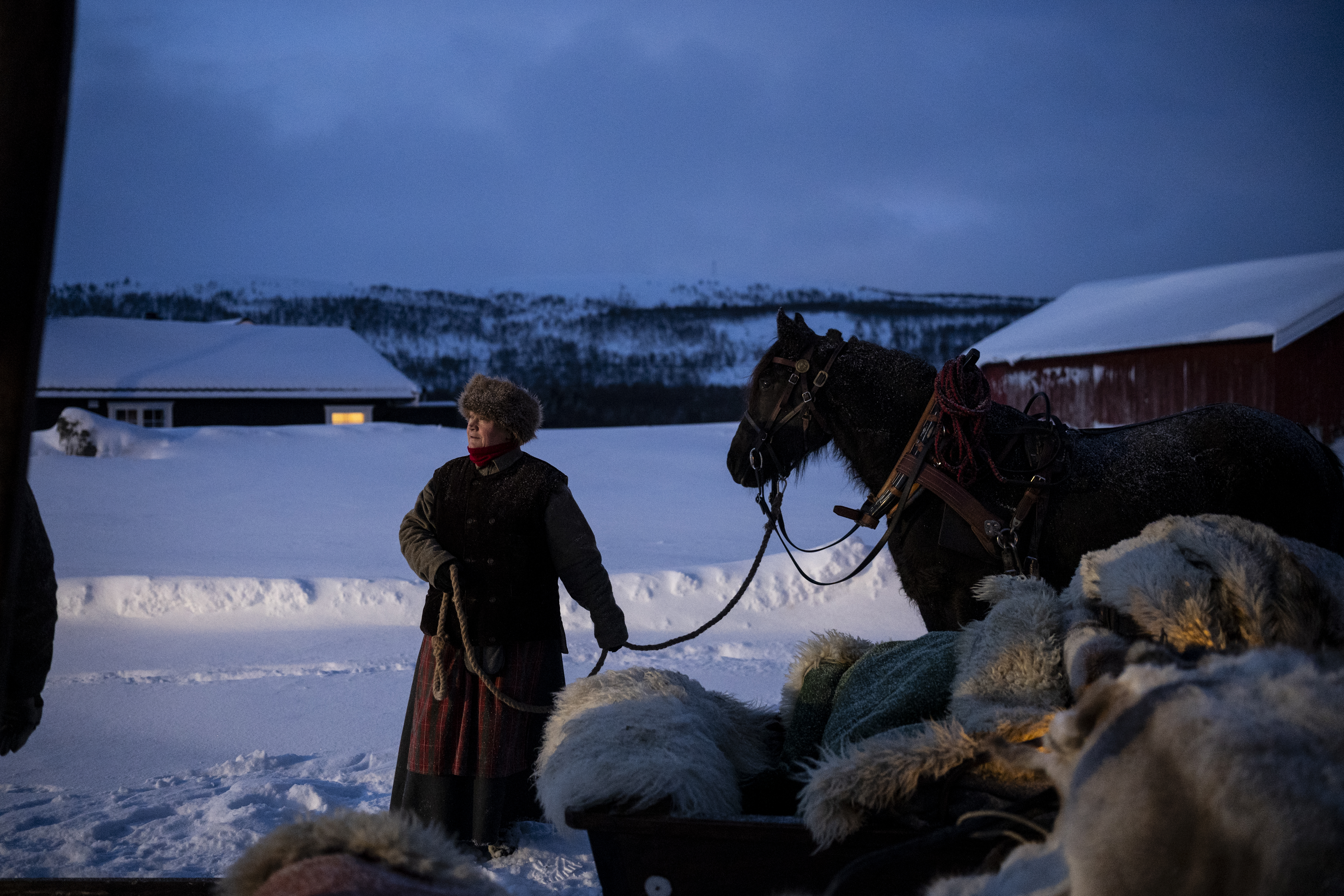 Oppmøtet er klokken sju på Billhaugen, en og en halv mil utenfor Røros sentrum. Blåtimen har tatt over for tussmørket og hestene vrinsker spent. Kuskene har kledd seg opp i store pelskåper og pelshatter av ulv, får og hund. Under har de lag på lag av tradisjonsrikt vadmel for å holde kulden ute. De er opptatt av autentisitet, så før jeg får ta plass i sleden blir også jeg kledd opp i pels og snørt igjen av vakre vevbånd for å holde pelsen på plass. Stilen er upåklagelig, og de plagsomme små blå trenger ikke gjennom den gamle bikkjepelsen.