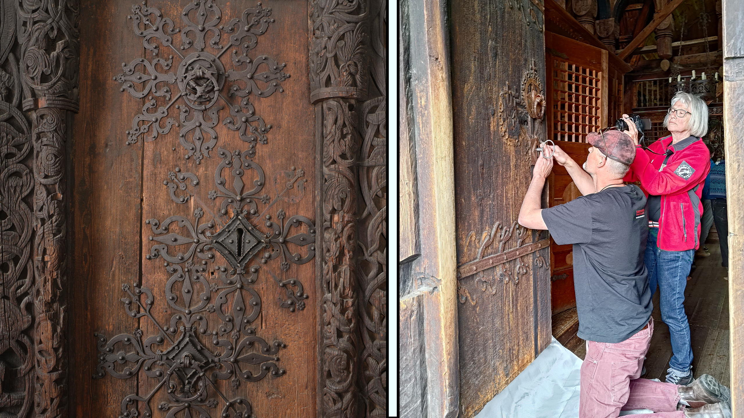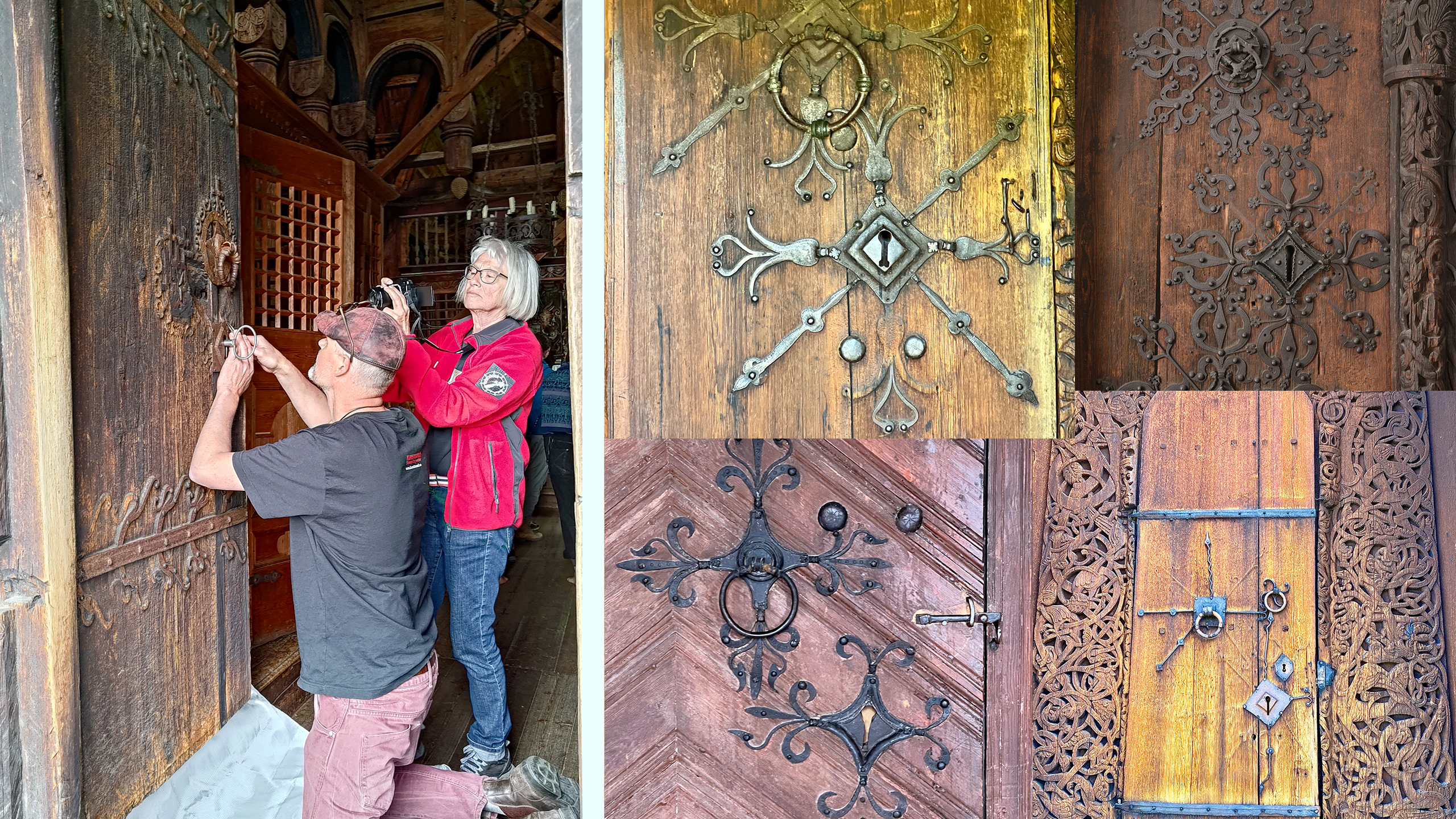 For å finne svar - eller forsøk på å finne svar - er det satt i gang et forskningsprosjekt der deltakerne har ulike kunnskaper: kunsthistorikere, kunstsmeder, arkeologer, metallurger. Undertegnete kunsthistoriker og kunstsmeden Steven Carpenter (Fig. 9) har på forsommeren i år vært på tur til sju ulike middelalderkirker for å ta fysiske prøver av smijern. Det skjedde med tillatelse fra Riksantikvaren og med velsignelse fra kirkenes ulike eiere. Prøvene ble tatt ved gamle bruddflater eller på baksiden av dørringholdere, og det er helt umulig for andre å se spor etter inngrepene. Prøvene er sendt til metallurger ved NTNU for analyse. I tillegg til disse prøvene er det tidligere tatt to prøver (Reinli og Hedalen stavkirker), og det er søkt om å få ta sju prøver til i museumssamlinger.