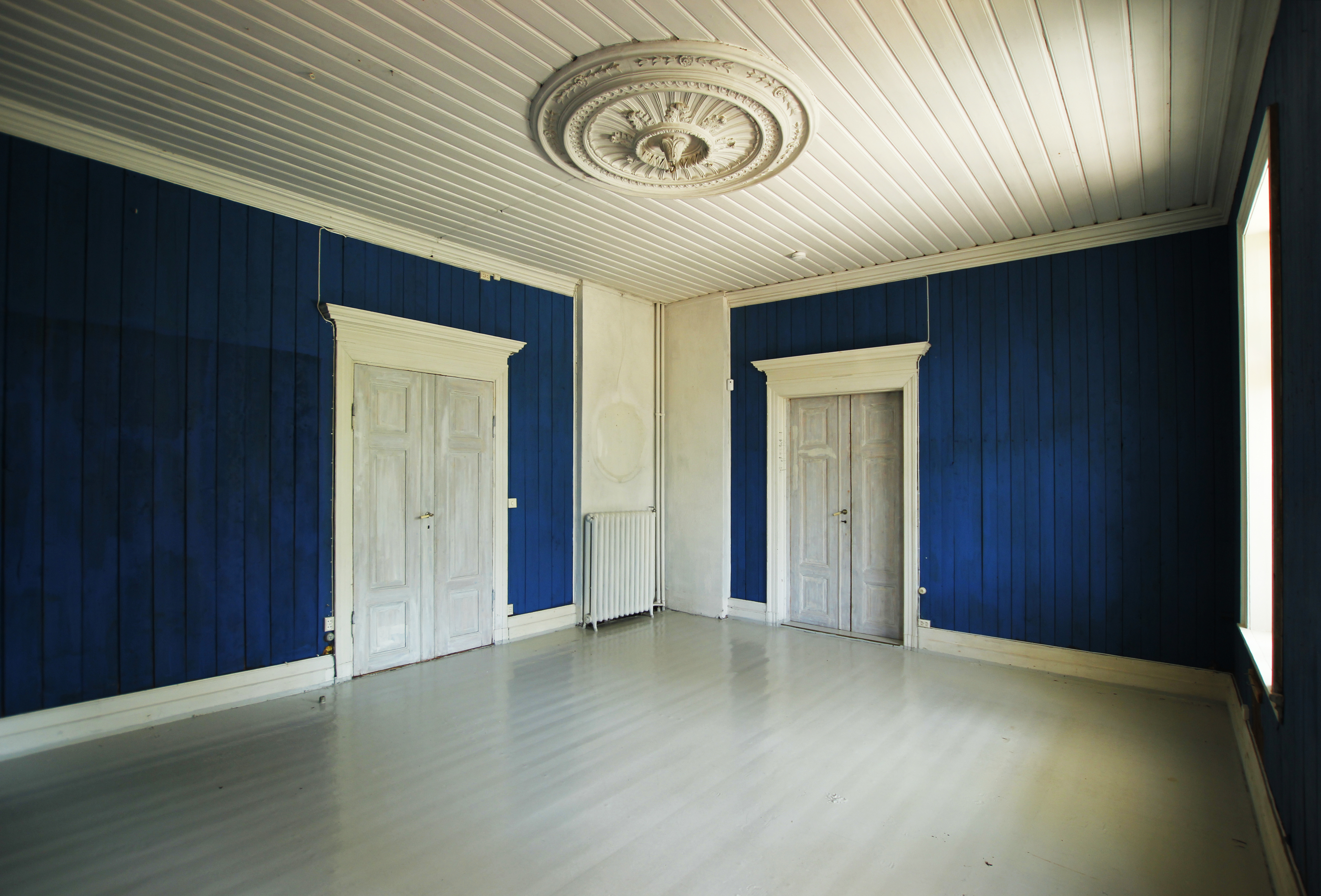 - Når linlerretet er ferdig spent opp på veggfeltene, blir det påført varmt hornlim. Når limet er tørt blir lerretet helt stramt som et kunstnerlerret på en ramme, forklarer Brænne. Deretter påføres to grunningslag med hvit linoljemaling. Deretter er det fem strøk med linoljemaling.