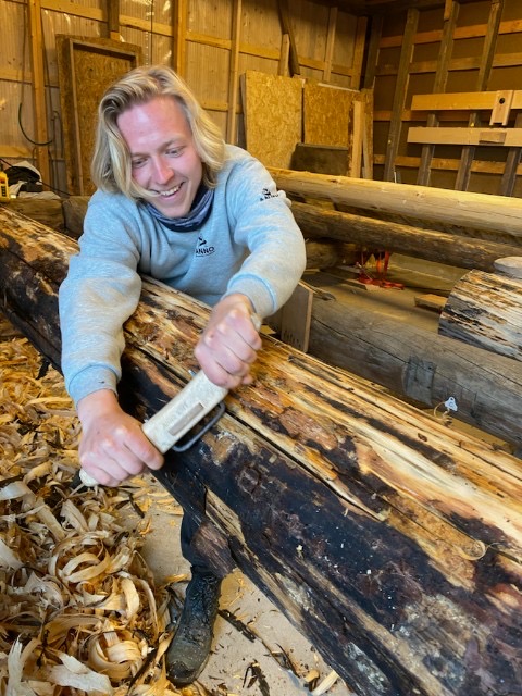 Rebekka begynte som voksenlærling i tømrerfaget i 2021 og satset på drømmen om å bli håndverker. Da hun senere deltok på jenteworkshop i regi av Fortidsminneforeningen fikk hun øynene opp for noe enda mer spennende innen faget. HUn har også vært med på kurs i rotknær og grindverkskonstruksjon i Tvedestrand og laftekurs på Abborhøgda.
