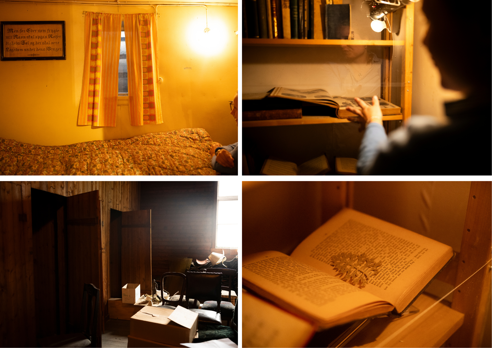 På innsiden finner man et stort, åpent oppholdsrom. Langs veggene går bratte grønnmalte trapper og dører som nesten forsvinner inn i panelene. Åpner man dem, trer man inn i en annen verden, i små rom hvor man kan få innblikk i hvordan beboerne levde. Å skape en utstilling som formidler hele historien har vært utfordrende, forteller Pettersen.