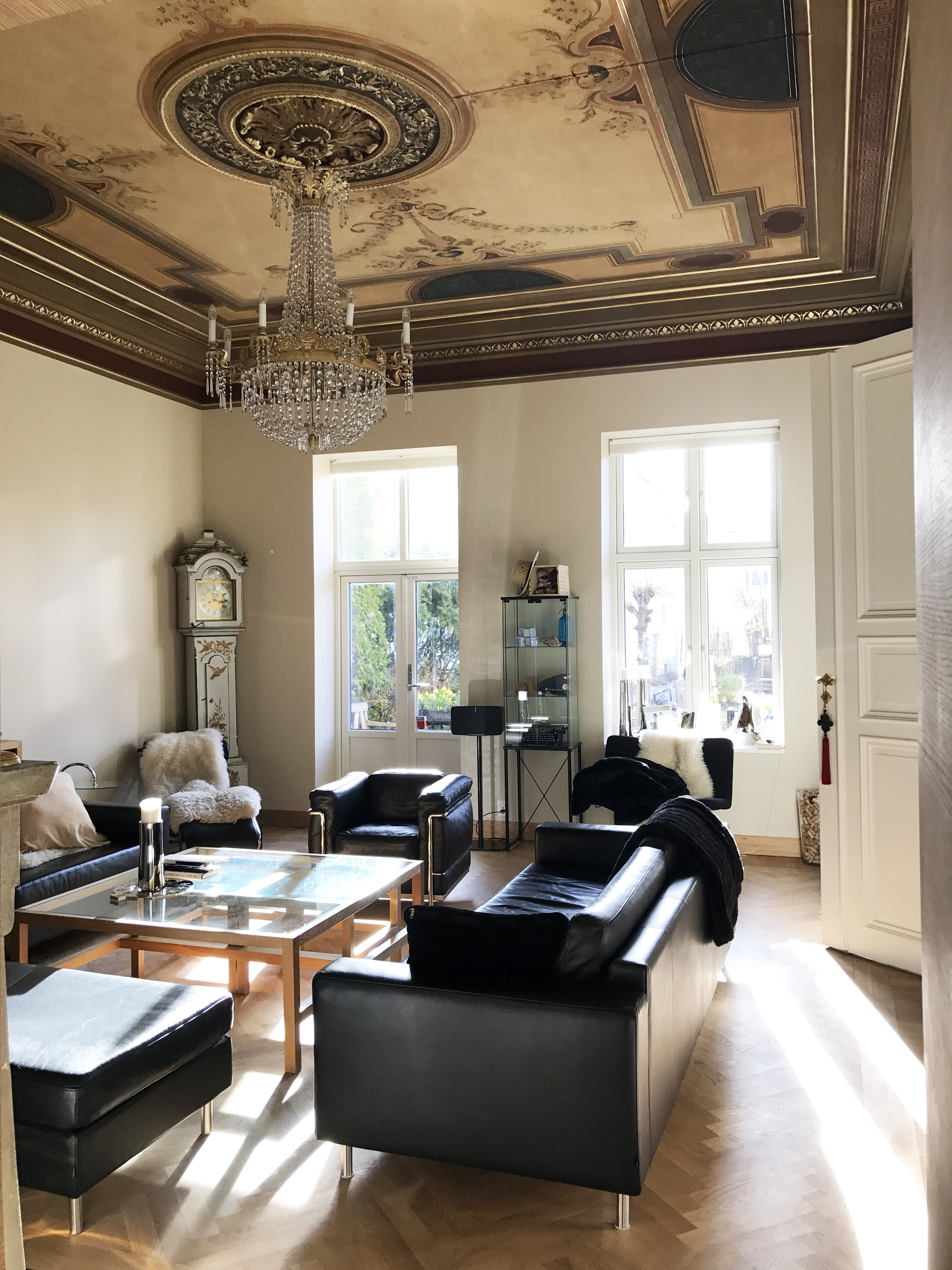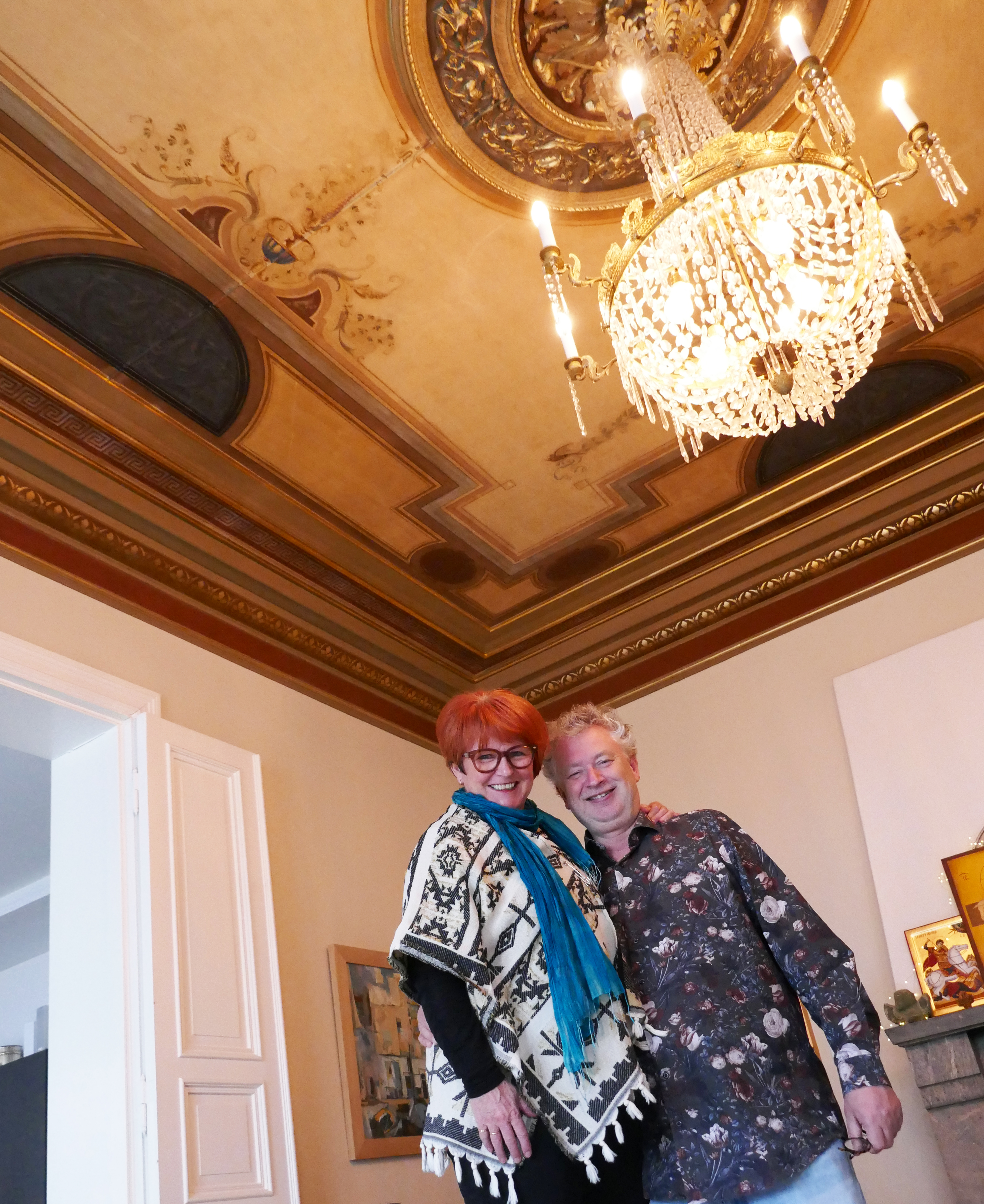 Arbeidet tok tre-fire måneder. Da ble det også praktfullt – og fint samstemt til taket i stuen ved siden av. Der var takdekorasjonene ganske godt intakt, men både den malte dekoren og gipsen måtte renses og restaureres.