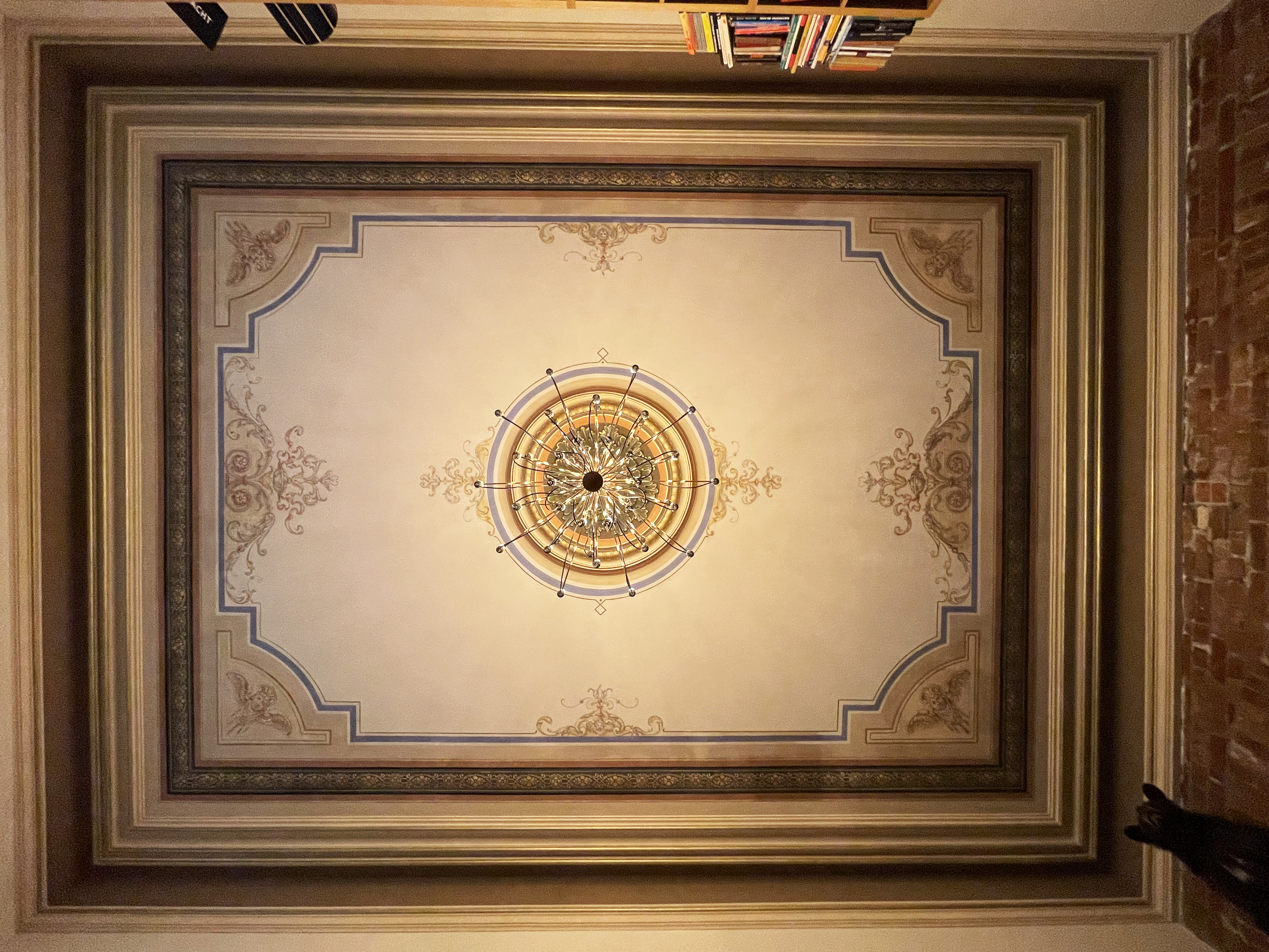 Grunnen til at takmaleriet i hovedstuen ikke var overmalt eller ødelagt i årene løp, forteller Tom Lorentzen, er trolig at første etasje i bygningen lenge ble brukt som herreklubb. Og når medlemmene koste seg med en pjolter eller spilte biljard, passet det jo fint med litt engler og blomsterranker og fugler i taket.