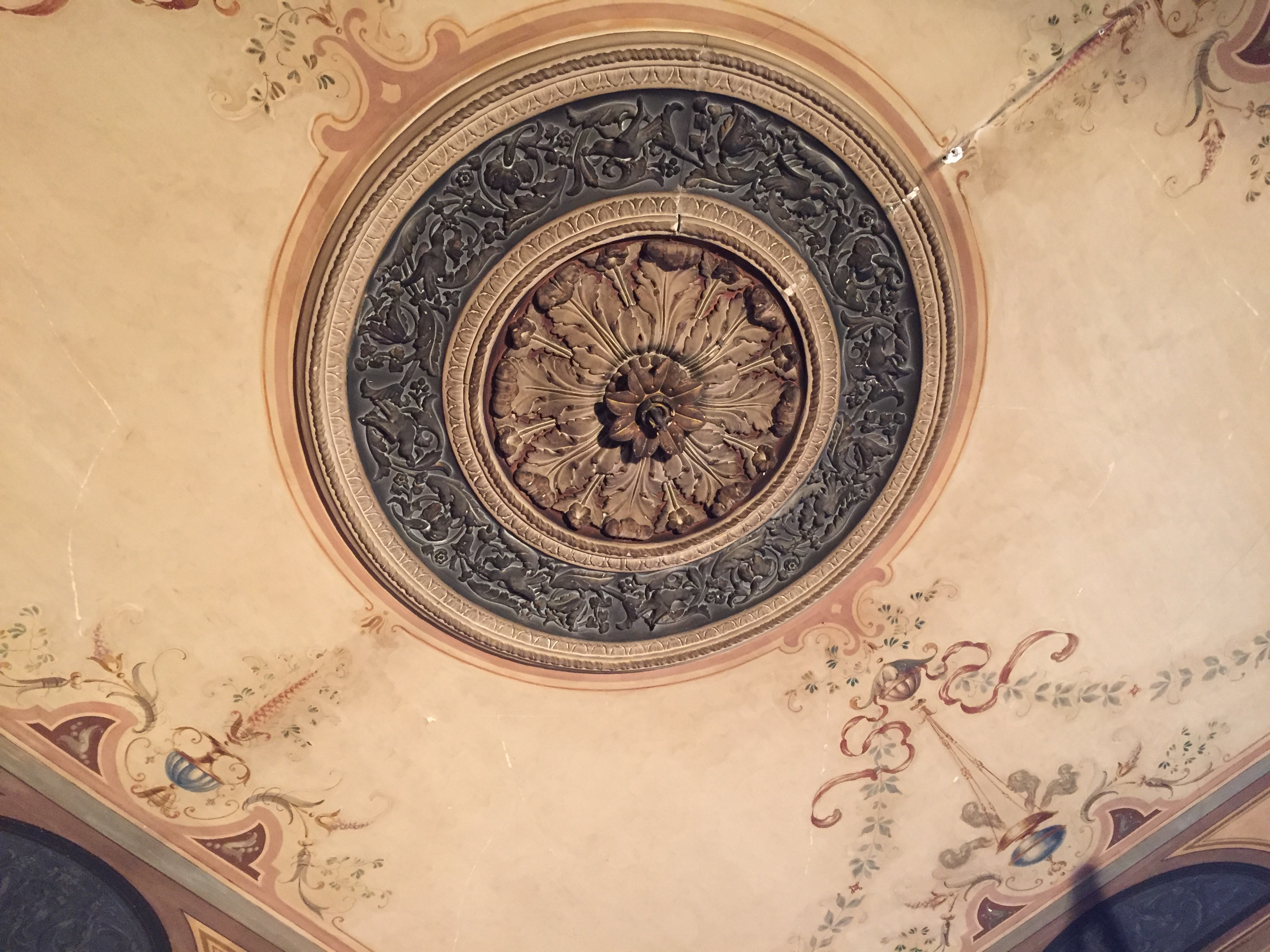 -Dette er en relativt enkel takdekor i nyrenessanse-stil som var meget populær i Nord-Europa og Storbritannia i tiden 1870-1900. Renessanse-stilen ble i sin tur inspirert av veggmalerier funnet i Roma i Neros gylne hus, Domus Aurea, som ble gjenoppdaget i begynnelsen av 1500-tallet, sier Malmberg.