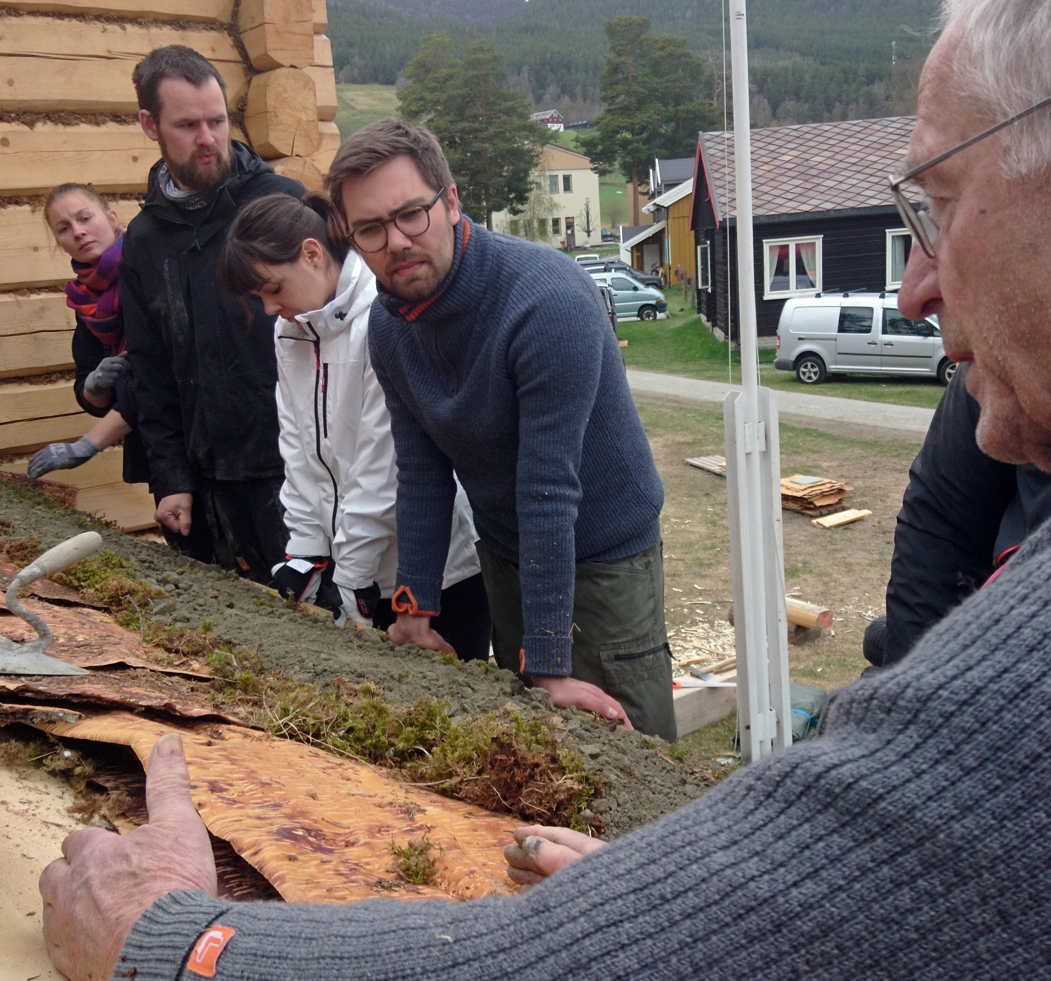 Omsider var det klart for å klatre opp stillaset og gå fysisk til verks. Arbeidet ble veiledet av Jon Bojer Godal og Steinar Moldal i samarbeid med to dyktige, unge håndverkere fra ressursgruppa til Fortidsminneforeningen, Anders Gimse og Jostein Utstumo. De to har vært på kurs i regi av Fortidsminneforeningen og har god erfaring med formidling av tradisjonshåndverk.
