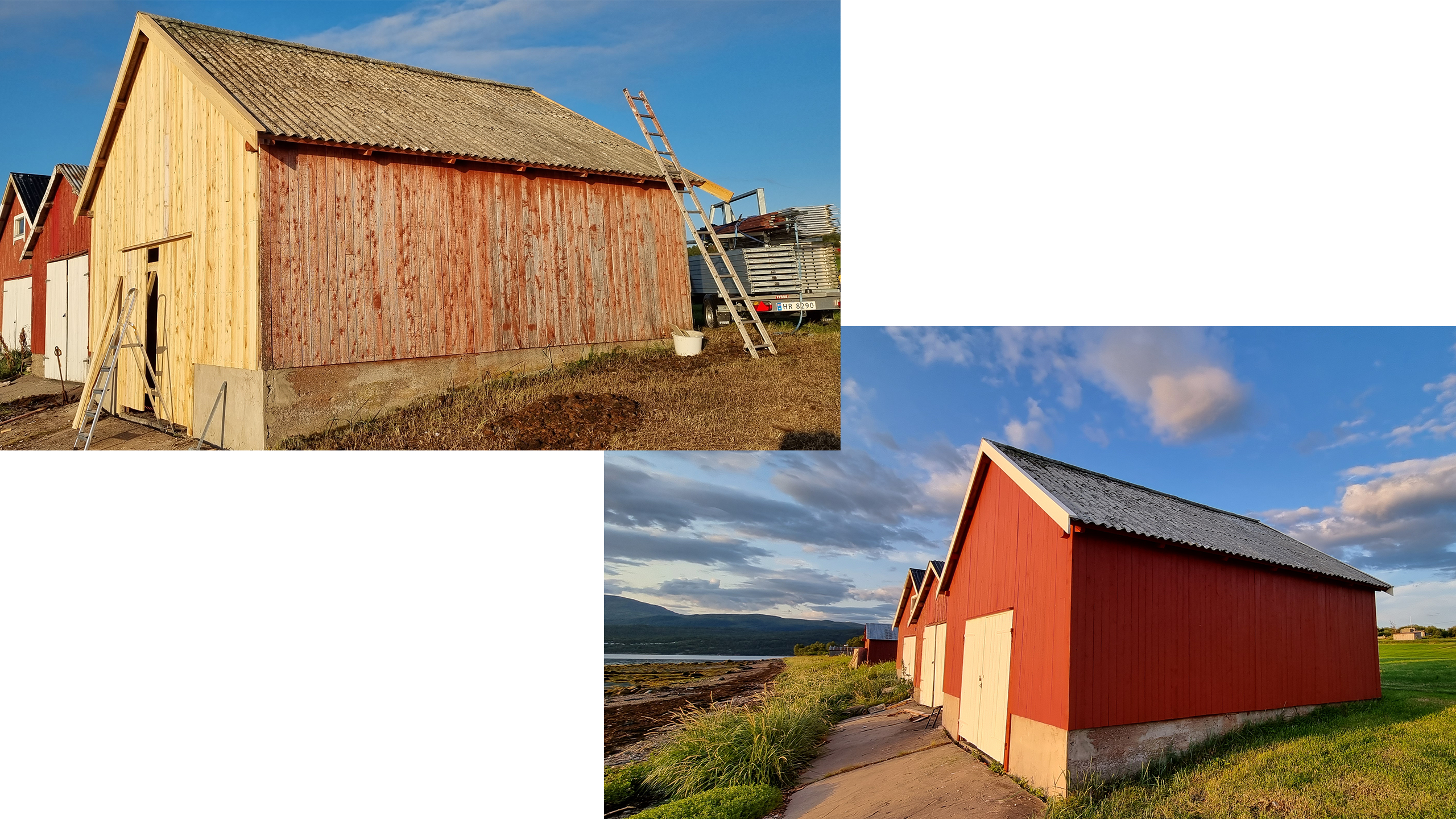 Jeg bor innerst i fjorden Malangen, i Balsfjord kommune, Troms, på ei bureisingsgård med i alt 13 bygninger. De eldste er fra slutten av 1800-tallet, det nyeste fra 2023. Naustet nede ved fjorden ble bygget i første halvdel av 1950-tallet, og jeg visste at det hadde vært malt med tranmaling opprinnelig. Etter første malingsrunde en gang på 1950-tallet hadde det ikke vært malt igjen. Veggene var nå matt røde og tilnærmet grå i farge, og særlig i fasadeveggen mot det verste været var malinga mer eller mindre borte. Her var det også en del råte i treverket, ellers så panelet fint ut.