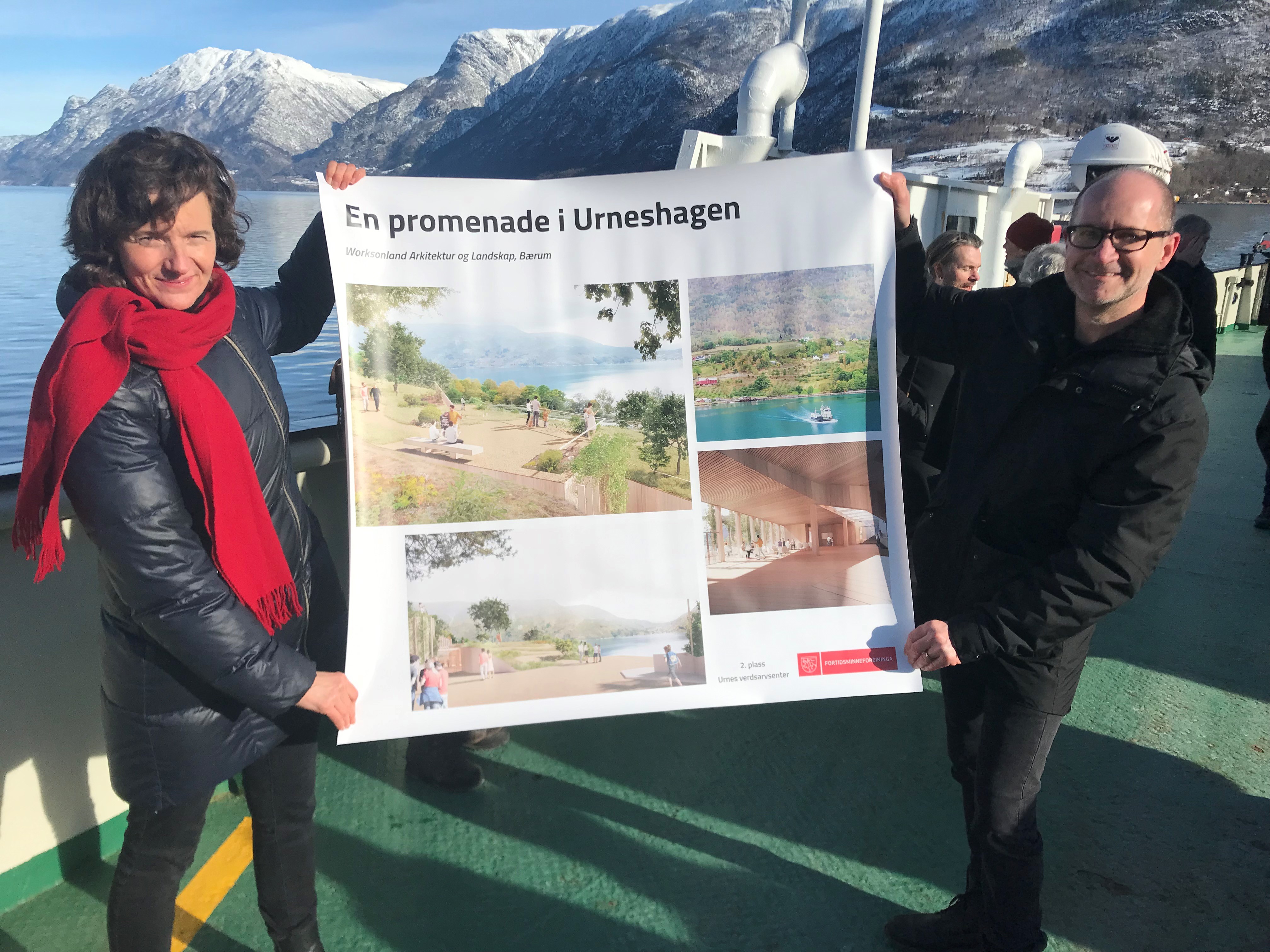 Vinnarutkastet og 2. og 3. premien vart offentleggjort ombord på MF Urnes, ferja mellom Solvorn og Ornes, den vesle bygda med den verdskjente attraksjonen Urnes stavkyrkje frå ca 1130. Ferja vart liggande midtfjords under seremonien, med utsikt til tomta der det nye besøkssenteret skal byggast og stavkyrkja på høgda bak.