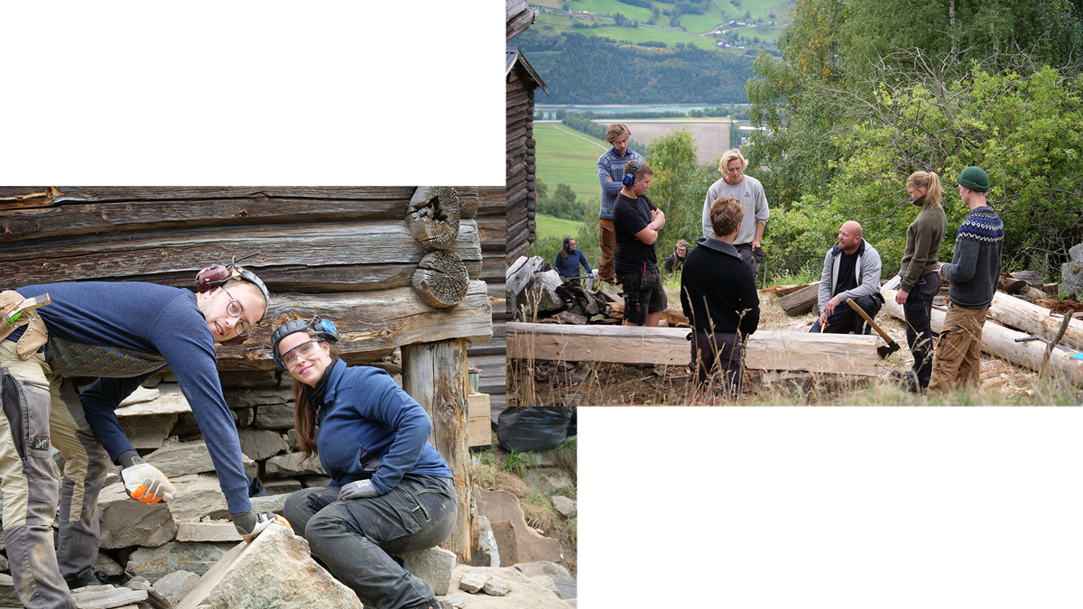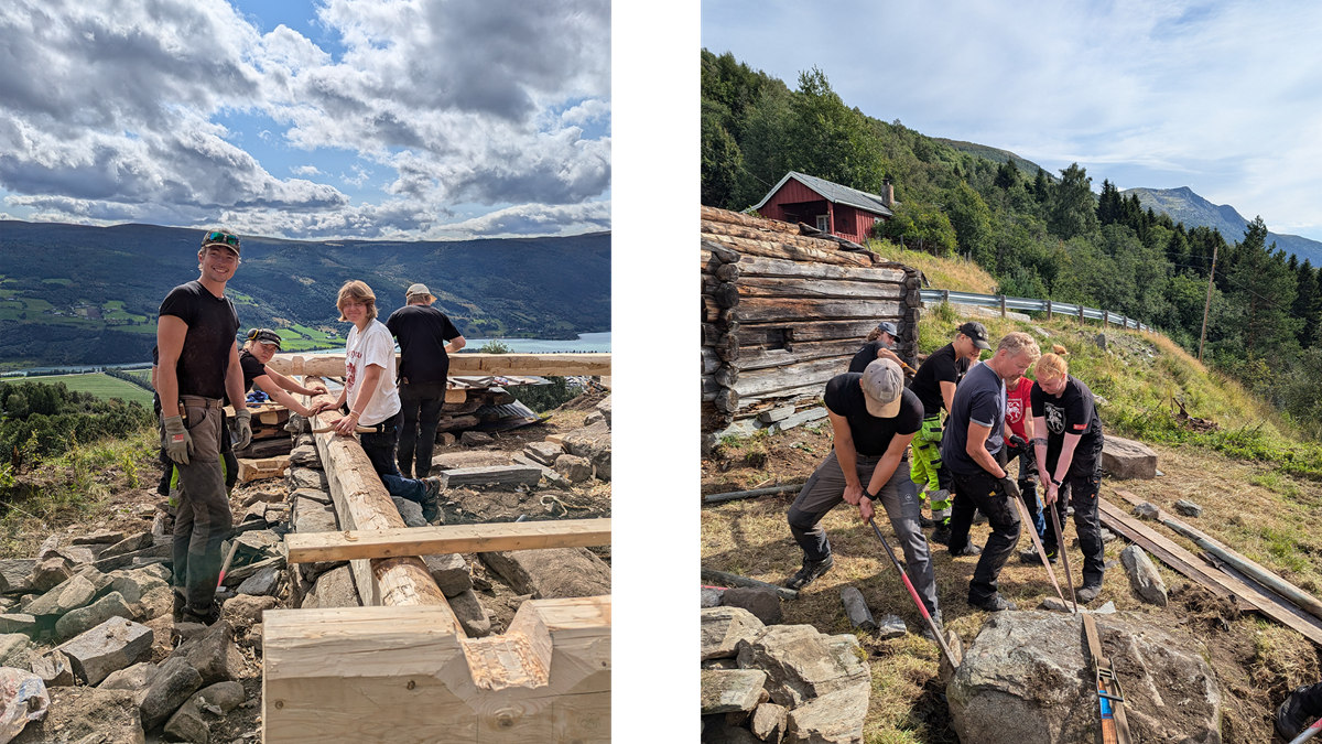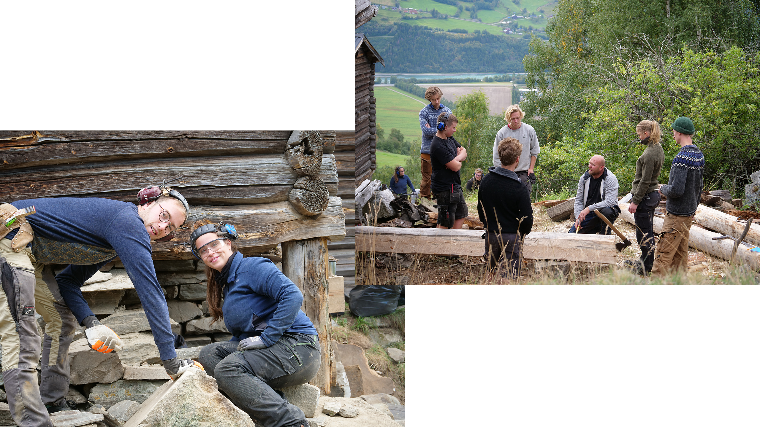Våningshuset som skal gjenreises våren 2025, har vært et samarbeid mellom Dovrehåndverkssenter og håndverkere fra Steinar Modal med kurs i både lafting og planlagte kurs i taktekking med torv og never.