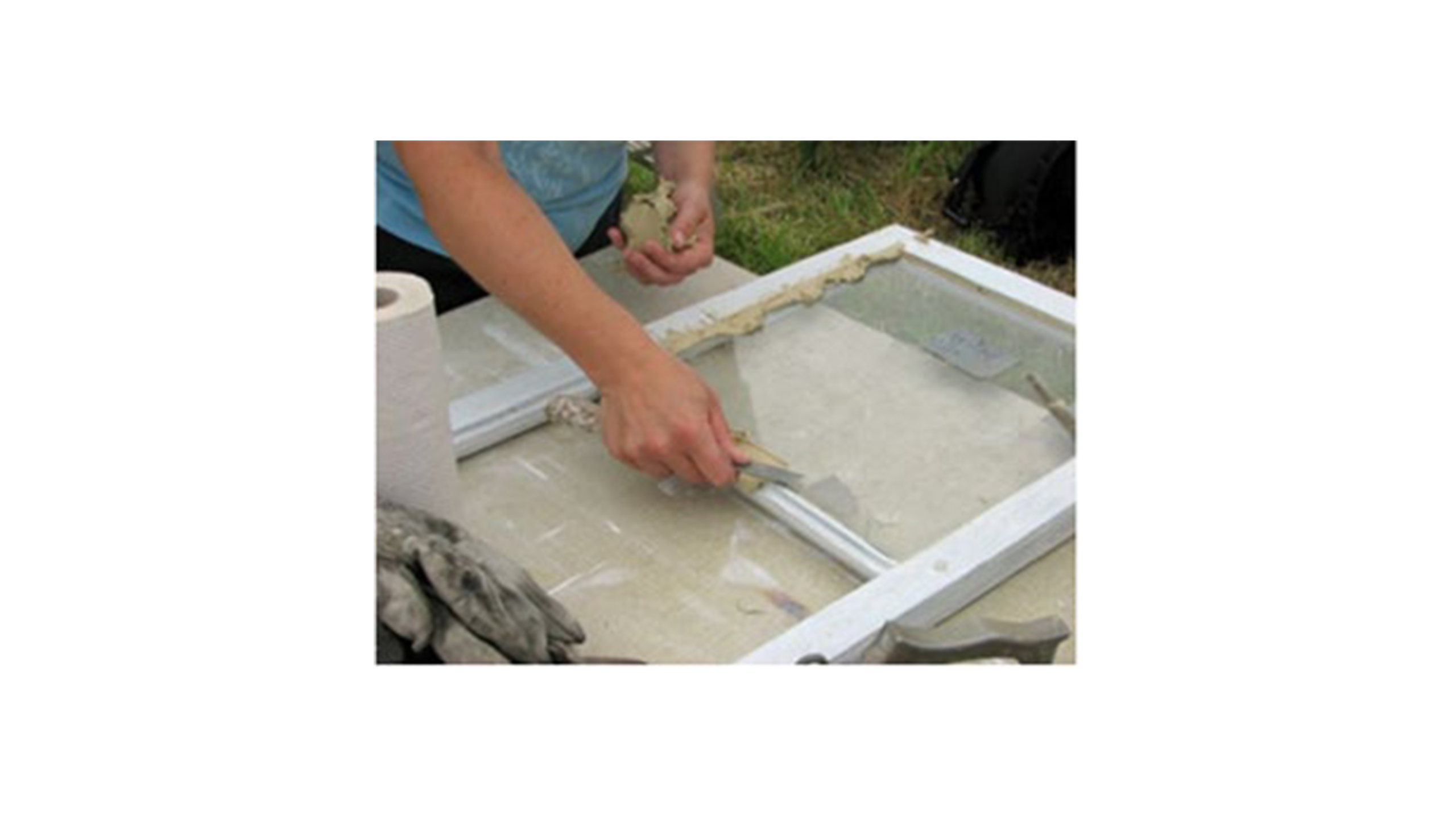 Legg kitt i falsen, og plasser glasset i ned i kittfalsen. Press eller vibrer glasset ned i kittet, enten med håndkraft eller med en slipemaskin. Bruk ekte linoljekitt.