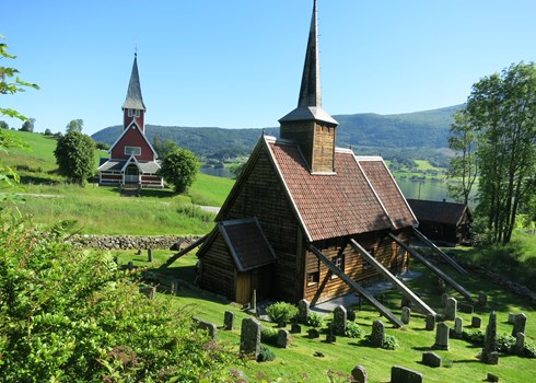 Distinctive stave church – on the outside and on the inside. The church as it stands today comprises parts from several periods. Originally, the stave church was a simple long church with a rectangular nave and somewhat narrower chancel. The remains of the south portal, which features twisted stalks ending in folded leaves, is unique among surviving stave church portals and can probably be dated to the first half of the 12th century. The south portal has probably been reused from an older church on this site built around 1100. During the 17th and 18th centuries, the church was substantially altered and renovated several times, including after a storm in 1689. The church probably once had an external gallery that was removed around 1600, when the chancel was also pulled down and replaced by a new one of about the same width as the nave. A porch was also added. The outside of the church is covered in horizontal boarding, which is mentioned in the church accounts from the mid-17th century. The interior has painted decoration dating from the 17th and 18th centuries. On the northern side of the church we find a triumphal cross, dated to between 1250 and 1275, with a life-sized crucified Christ. This is one of Norway's finest examples of early Gothic style.