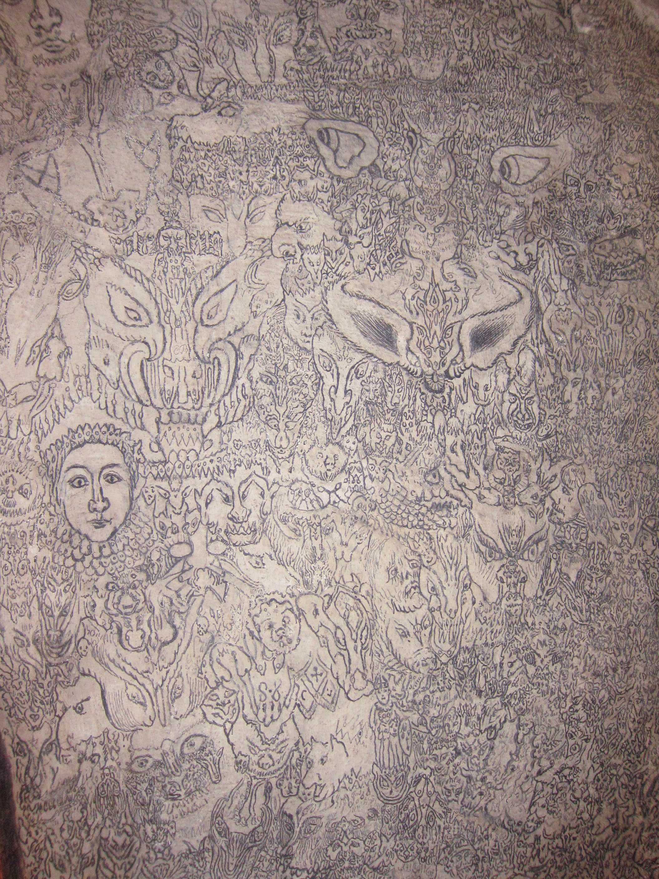 I svarte streker på hvit kalk er demoner og andre vesener malt i og rundt hverandre, flere så små at de ikke er synlige fra gulvnivå. Veggen ble avdekket av konservator Gerhard Gotaas i 1940-41. Den vakte stor oppmerksomhet og har siden vært et mysterium da ingen har funnet lignende paralleller. Våre undersøkelser har avslørt at det Gotaas opprinnelig fant, var fragmenter av hoder fra tidligere dekor. Veggen slik den nå framstår er derimot malt av Gotaas selv. Denne fortellingen handler med andre om både ytre og indre demoner.