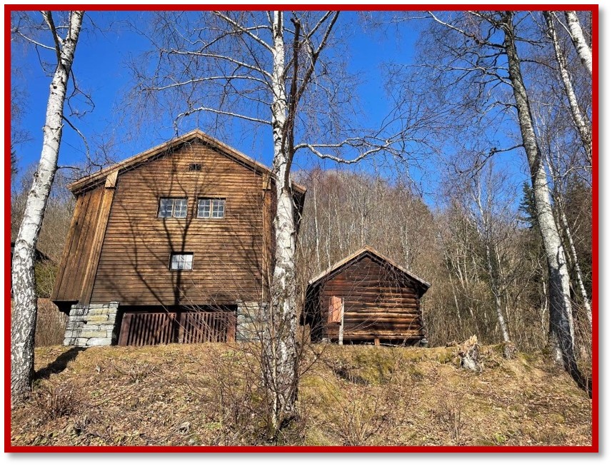 Det er tid for å raka og rydda rundt bygningane «våre», og fjerna bringebærris, rynningar og anna kratt i skråninga på oppsida, for å hindra at vegetasjonen kjem for tett på gamle vegger.