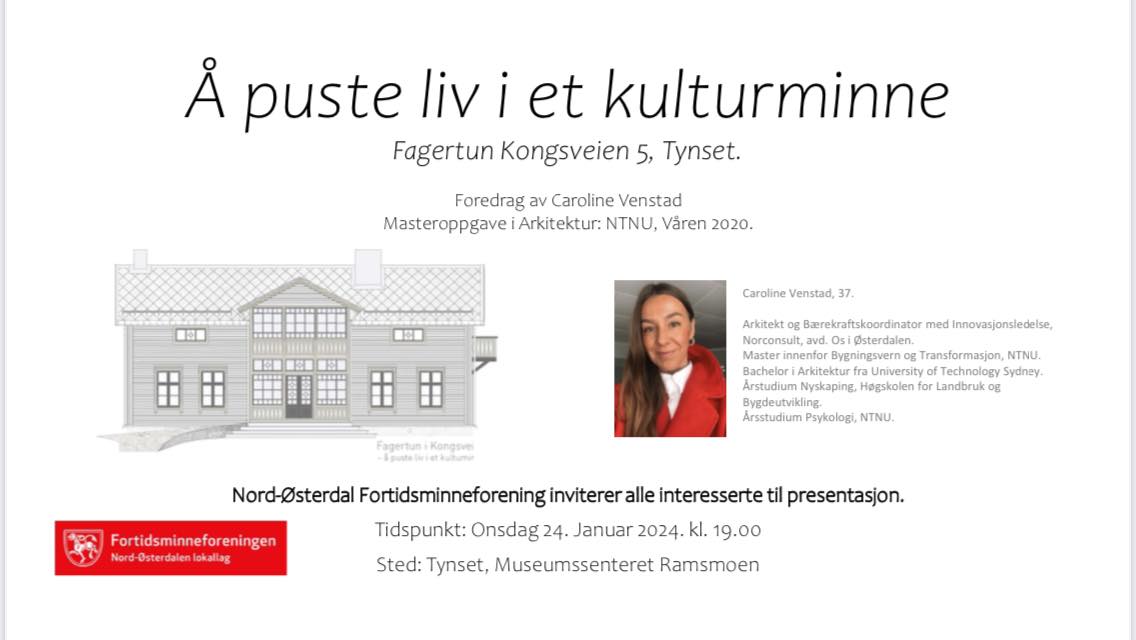 Hedmark: Nord-Østerdalen lokallag inviterer til foredrag med arkitekt og bærekraftskoordinator med innovasjonsledelse ved Norconsult, avd. Os i Østerdalen, Caroline Venstad. Møt opp på Tynset den 24.januar kl.19 for å høre om Å puste liv i et kulturminne, Carolines Masteroppgave fra NTNU fra 2020.
