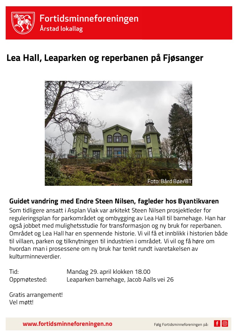 Lea Hall, Leaparken og reperbanen på Fjøsanger Publisert 23.04.2024 Årstad lokallag inviterer til guidet vandring!