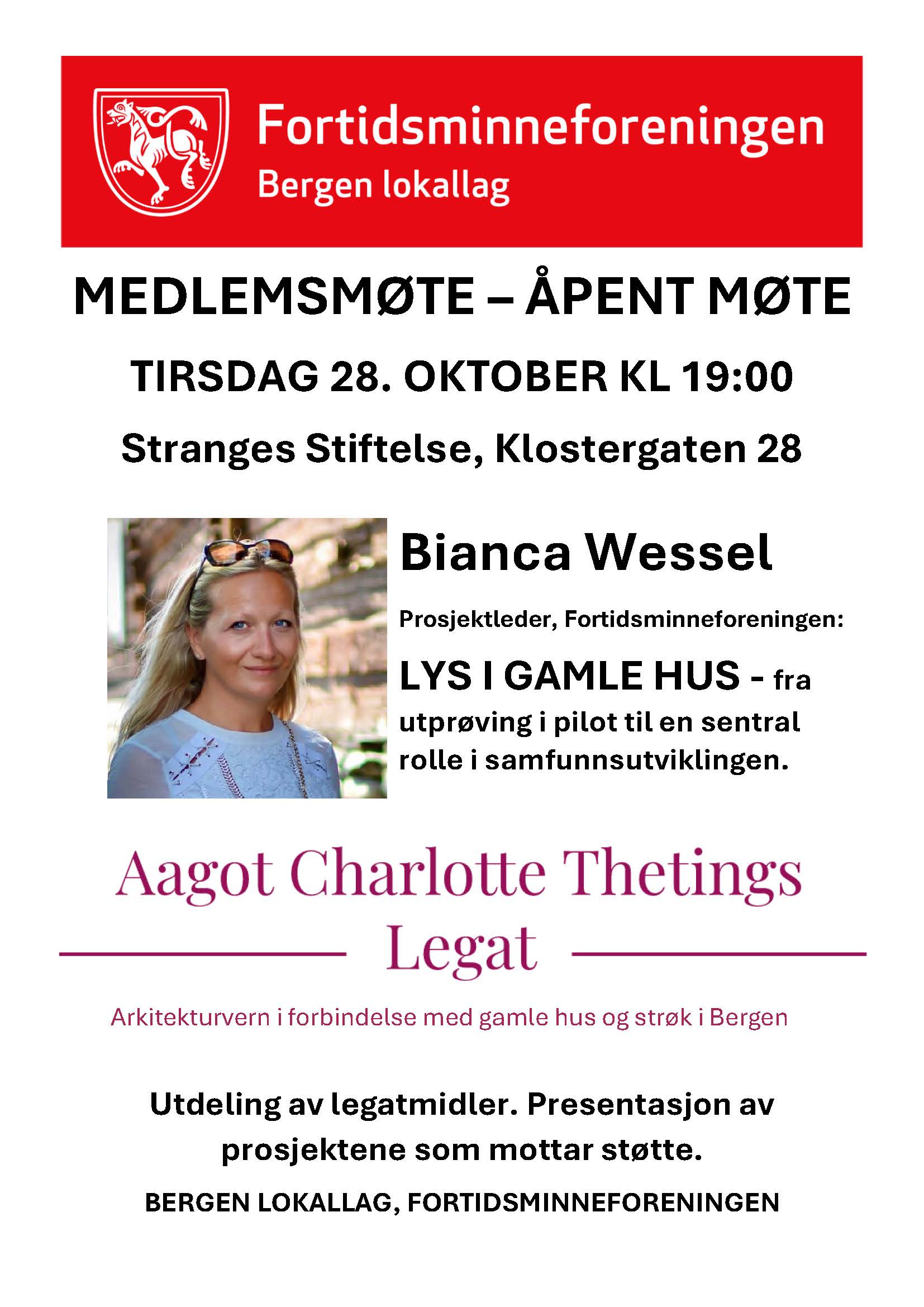 Bianca Wessel forteller om Lys i Gamle Hus: Fra pilotprosjekt til sentral rolle i samfunnsutviklingen. I tillegg deles det ut midler fra Aagot Charlotte Thetings Legat.