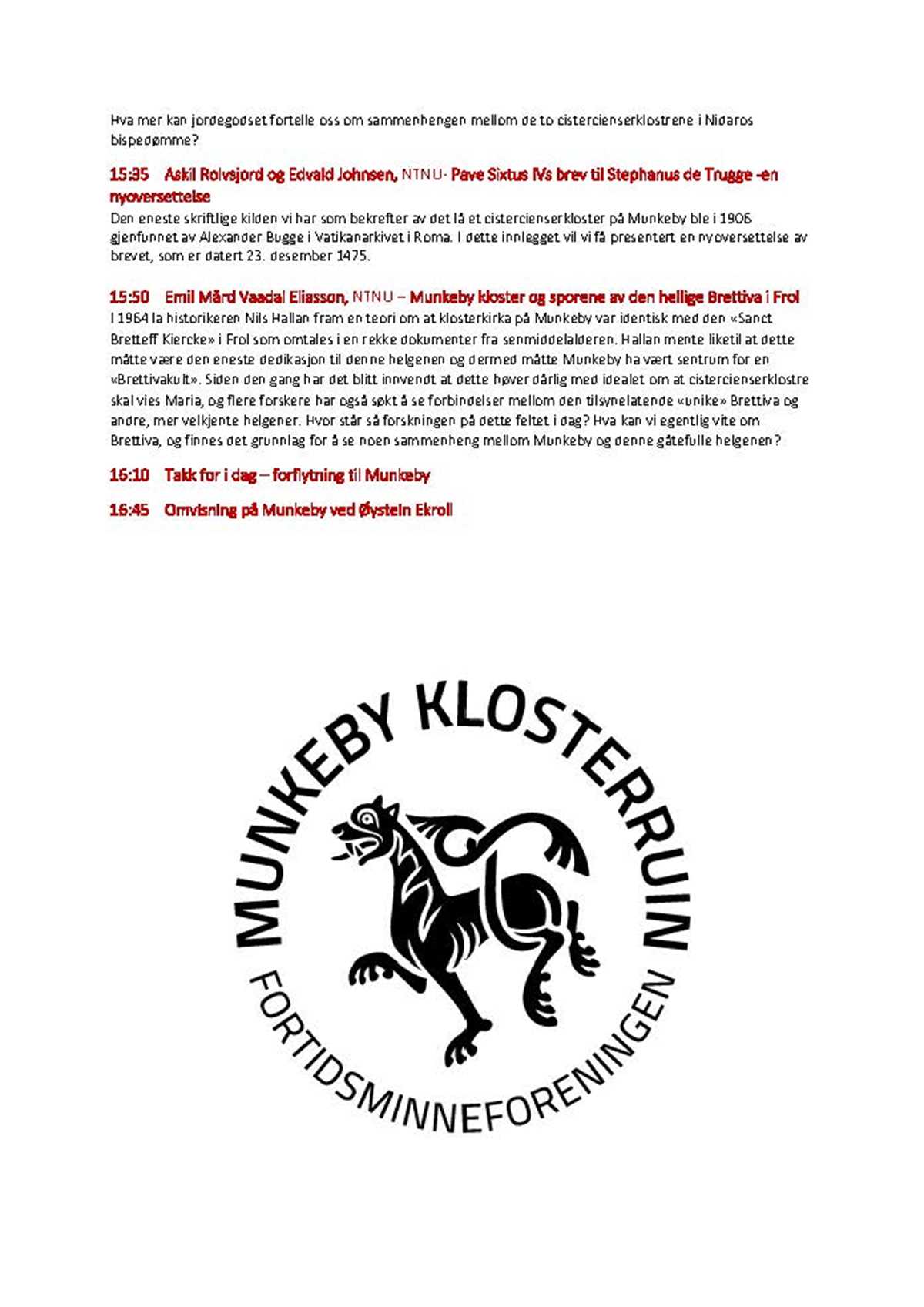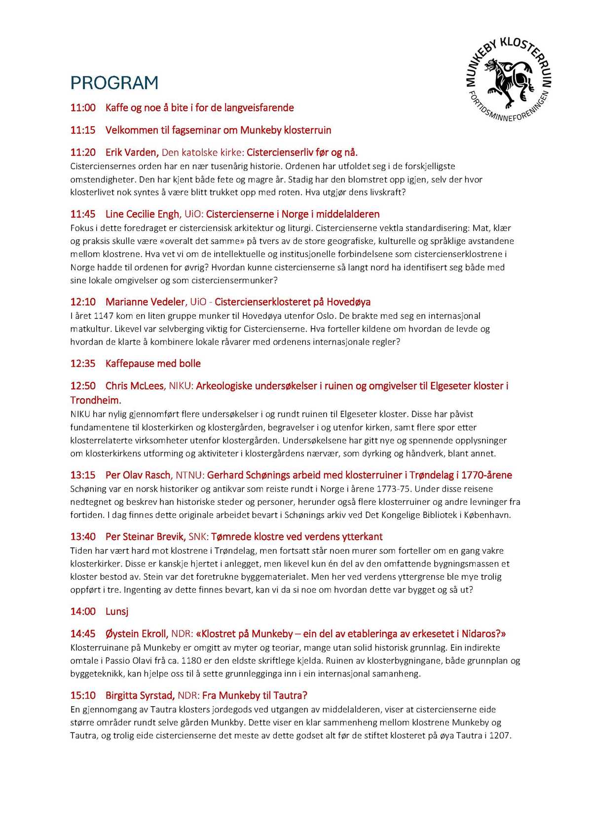 Vi håper foredragene vil være av interesse ikke bare for historikere og andre i fagmiljøet, men for alle med interesse for historie og kulturminner eller en forkjærlighet for klosterruinene på Munkeby!