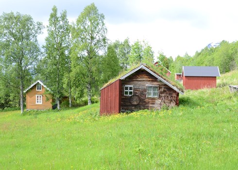 Fra gammer til bygninger. De første husene på gården var gammer. Hovedhusets tømmerkjerne ble kjøpt på Laksvatn i 1918, og ble gjenreist i 1922. Før dette bodde familien hos besteforeldrene på nabotomta, etterfulgt av en periode der familien på fem bodde i den gamle skjåen. Hovedhuset har to rom og soveloft, er utvendig panelt og okermalt. Av andre hus er der laftet langfjøs fra 1920-tallet – også kalt vinterfjøsen, sommerfjøs fra 1912, to skjåer, brønnhus for kjøling av melk i bekken og naust ved fjæra. Flere av husene var kjøpt brukt, tatt ned og fraktet til gårds for gjenreisning. Årets ulike tider hadde sine gjøremål, og jordbruk og fiske ble kombinert. Det var et dyrehold med ku og sau på gården. Far og sønn deltok på Vinterfinnmarkfiske og Lofotfiske, og den grønne reisekista de hadde med seg står der fortsatt. Før de reiste ble det bakt brød og lefse, og maten ble oppbevart i den lufttette kista. De reiste fra gården i mars og var borte et par måneder, til våronna skulle tas.